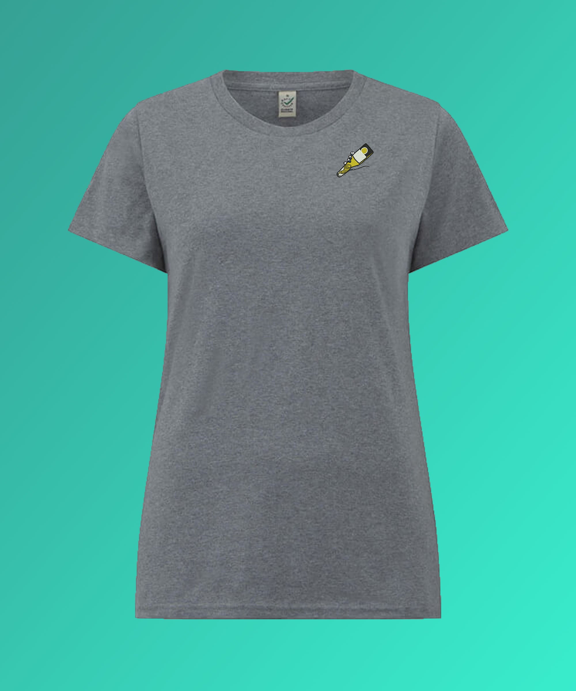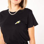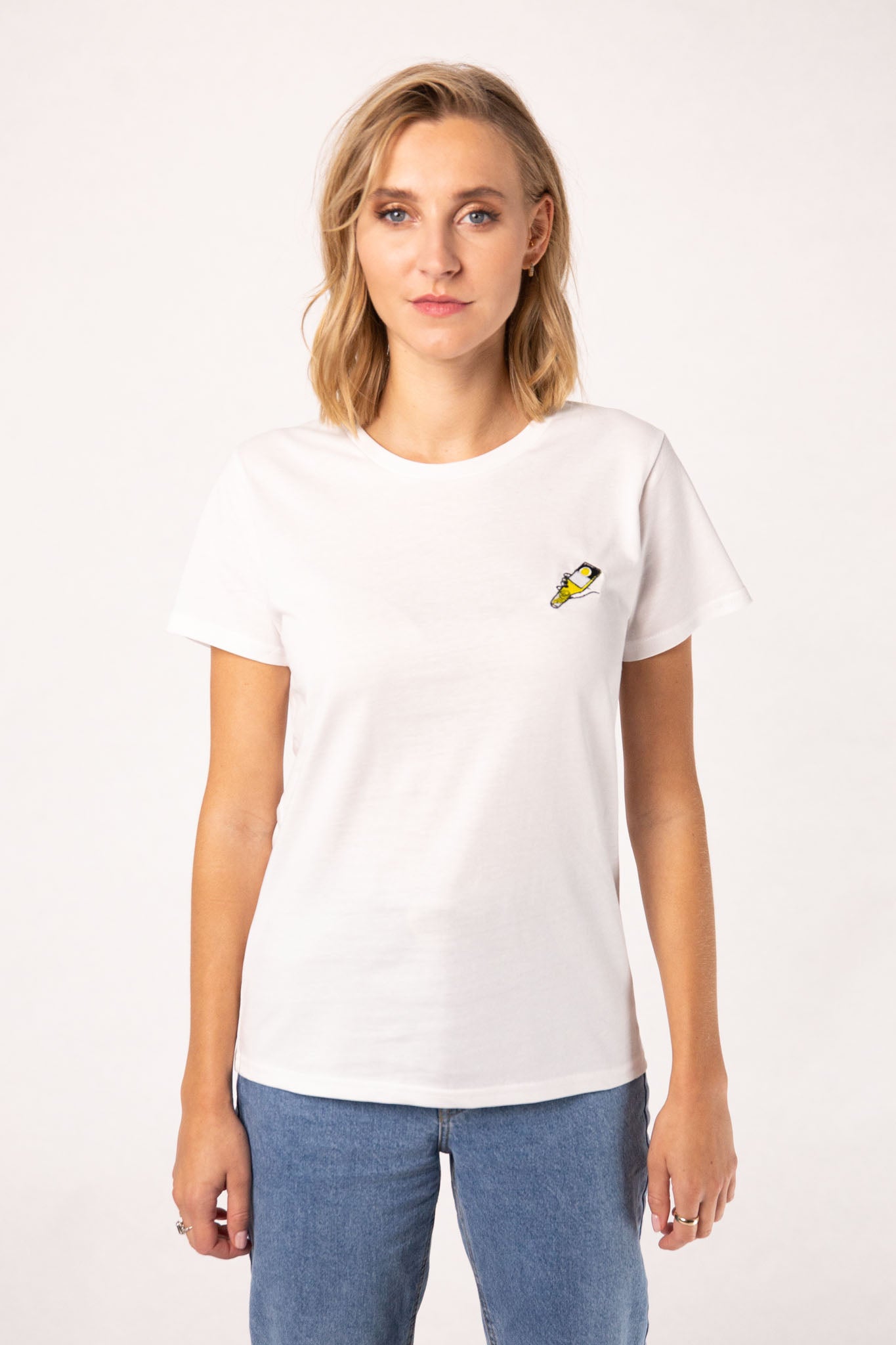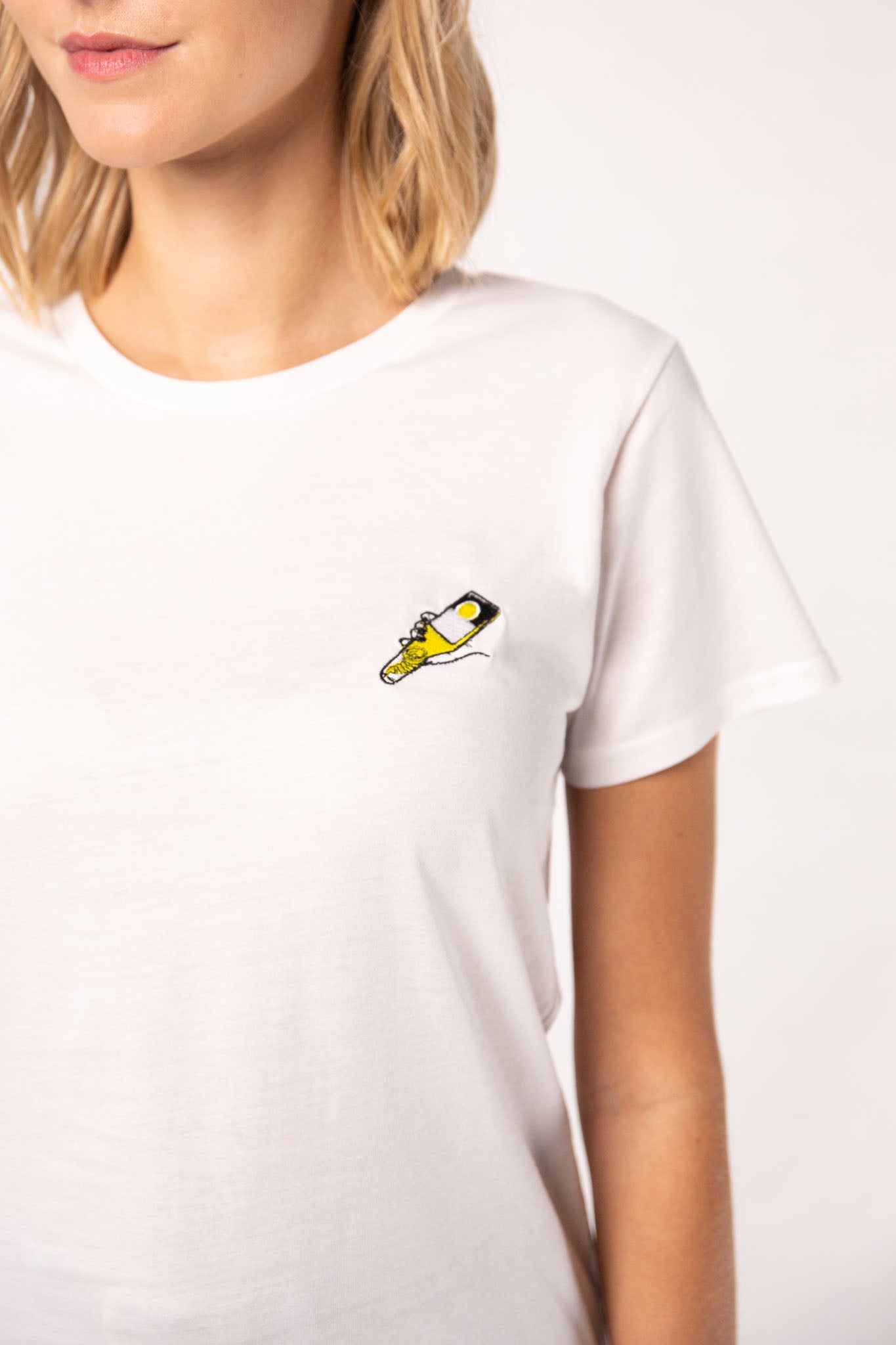 T-shirt en coton bio de très haute qualité pour femme, avec un tissu extrêmement agréable (155gsm) et un dessin de tornade brodé.