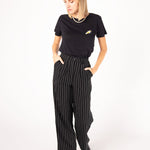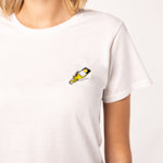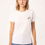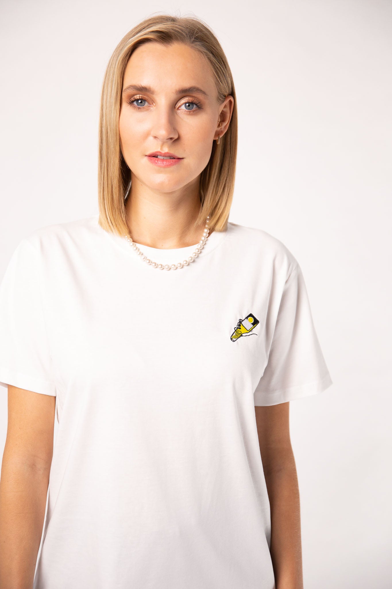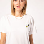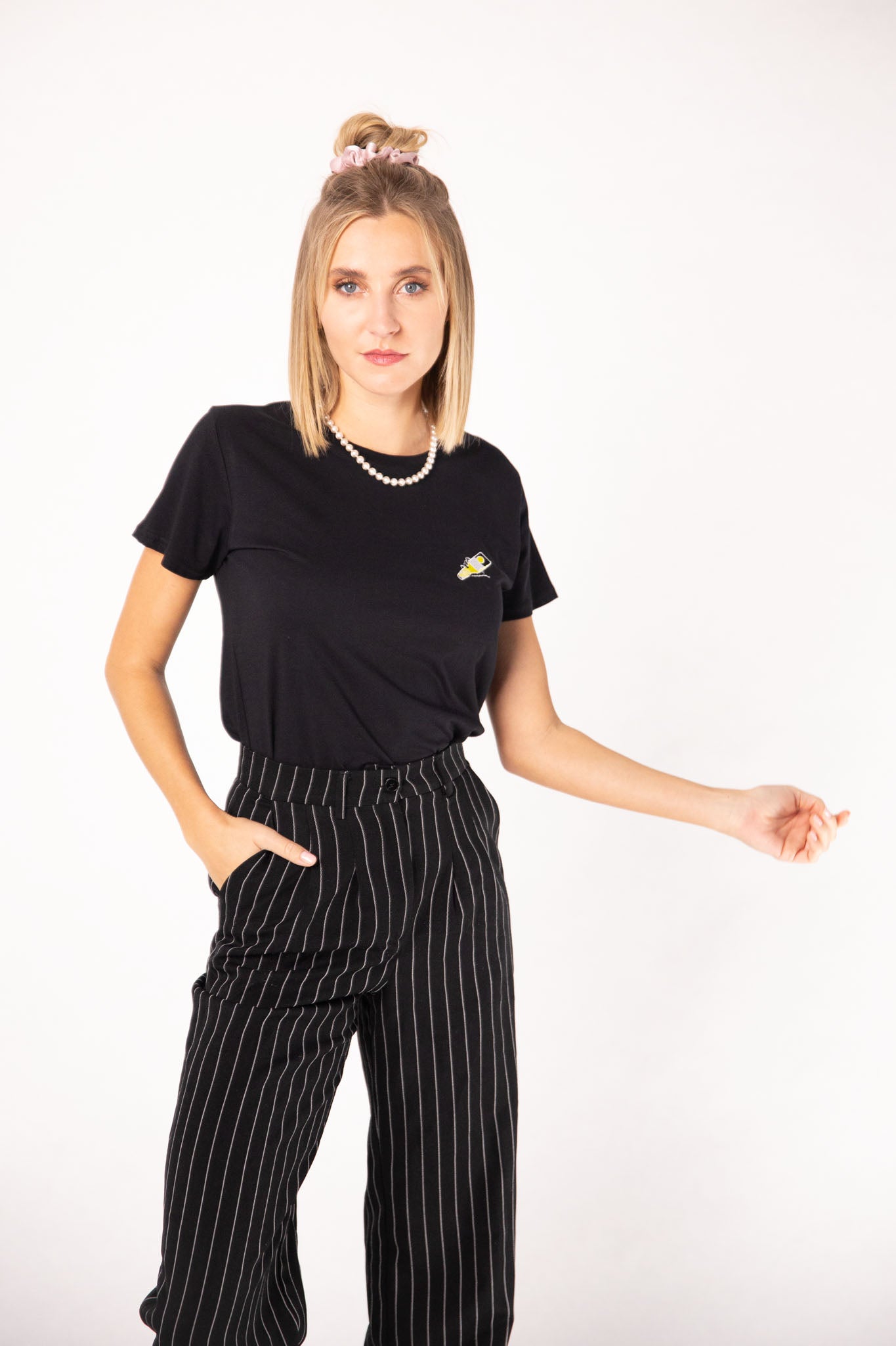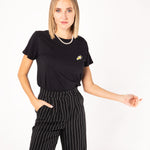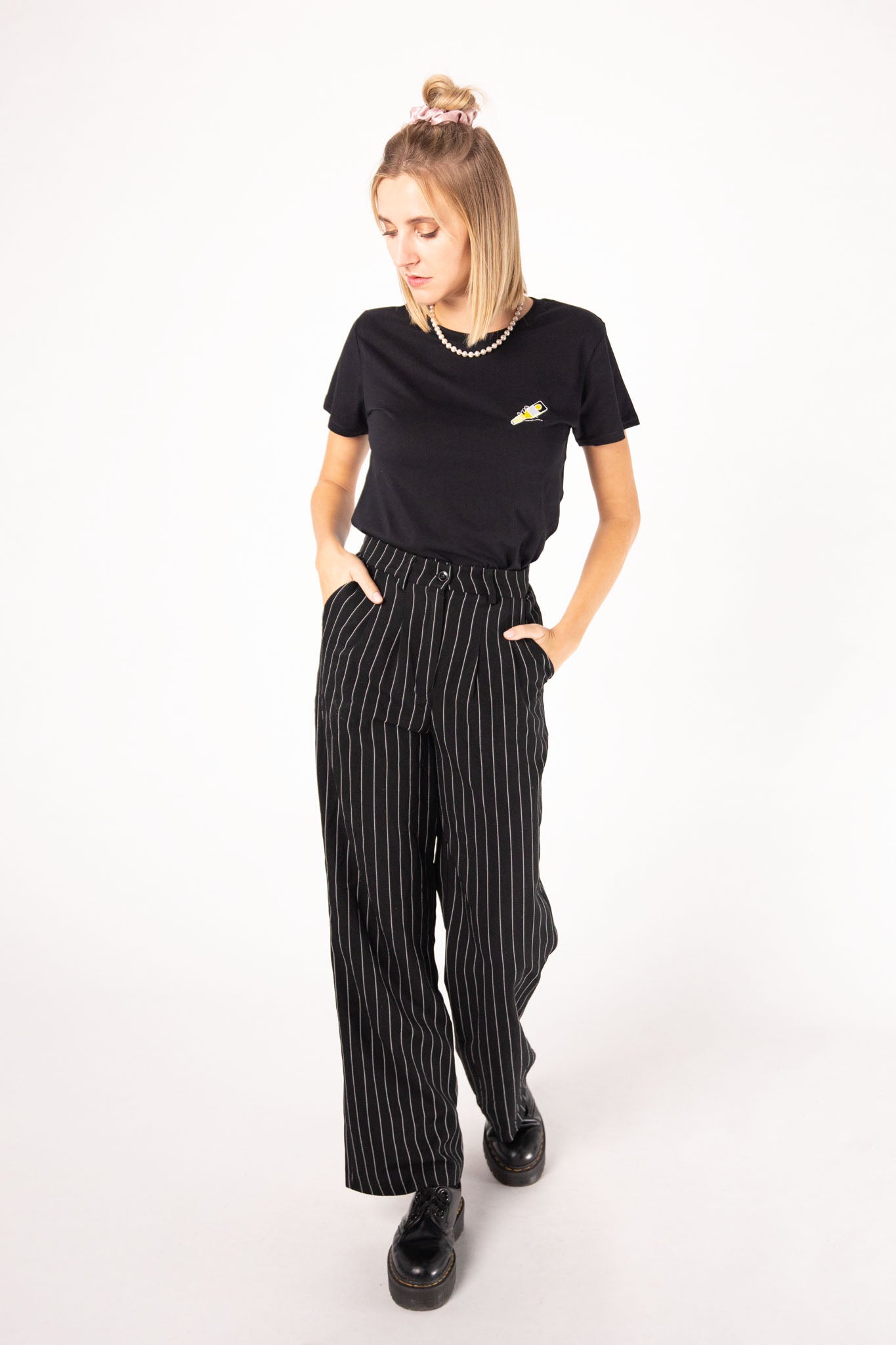 T-shirt en coton bio de très haute qualité pour femme, avec un tissu extrêmement agréable (155gsm) et un dessin de tornade brodé.