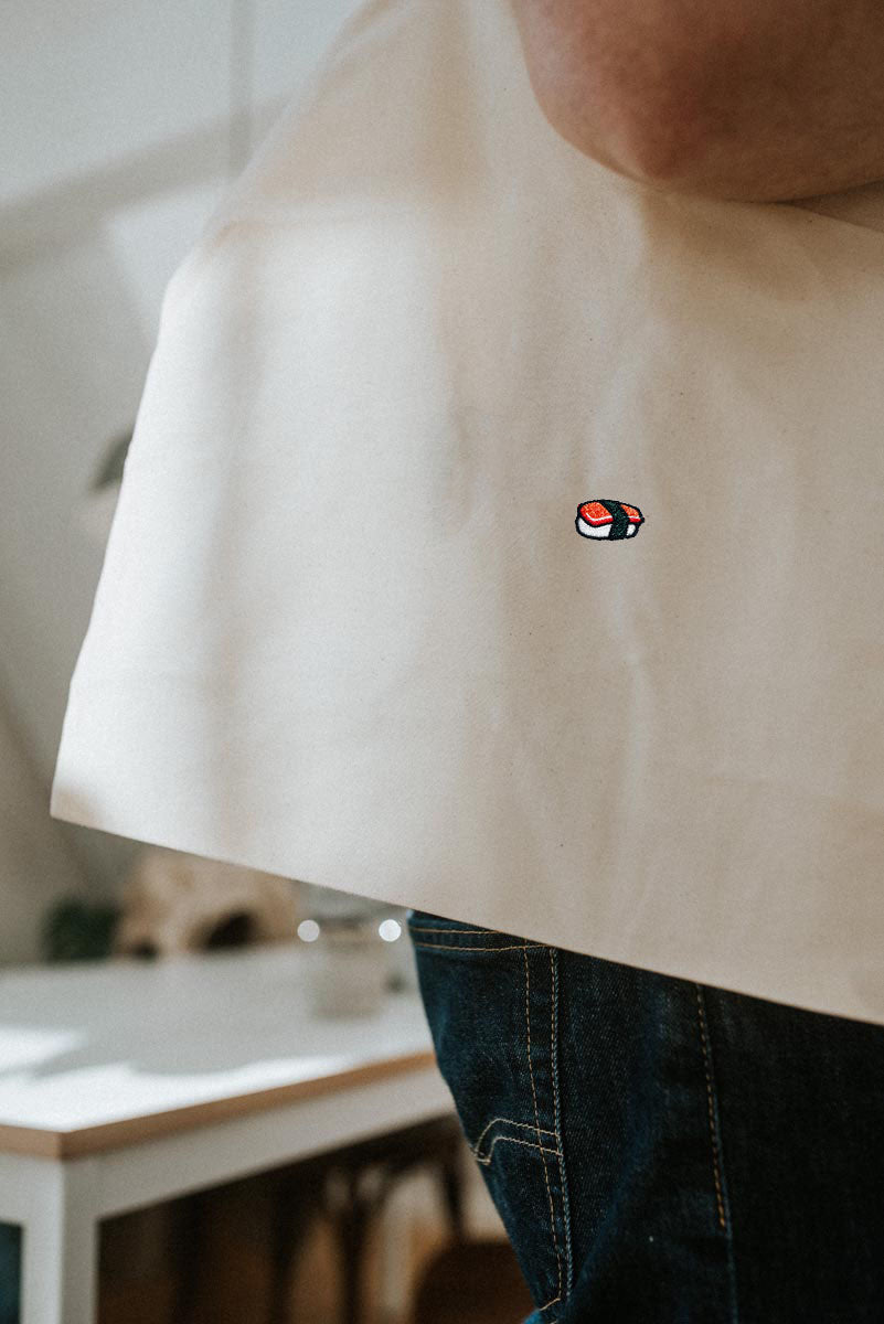 Bestickte, fair produzierte Bio-Baumwoll-Tragetasche im Sushi Nigiri Design.