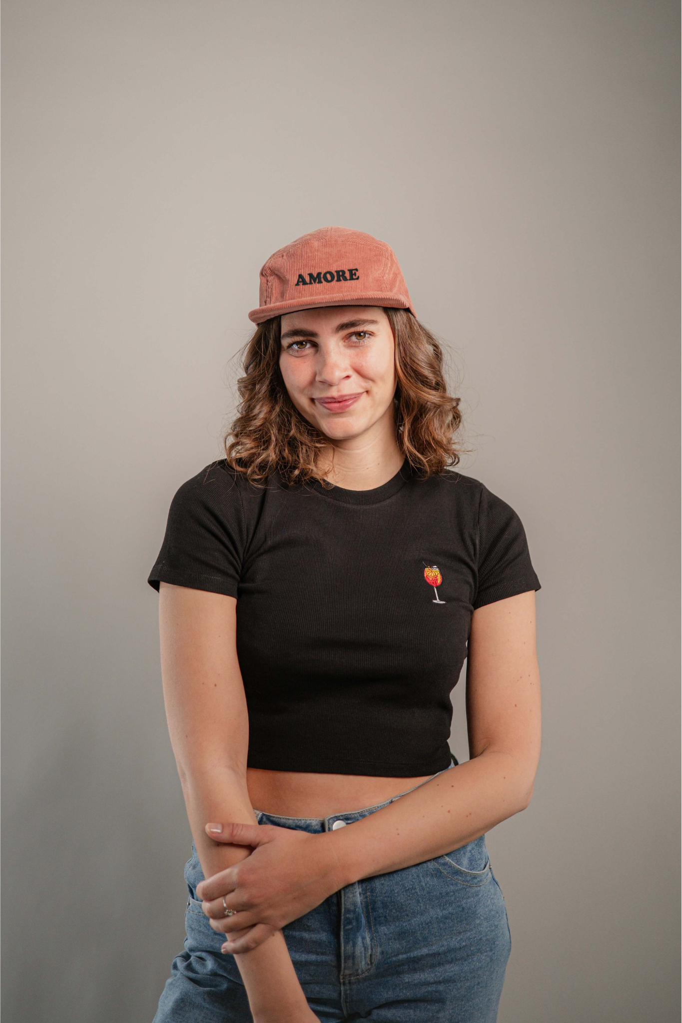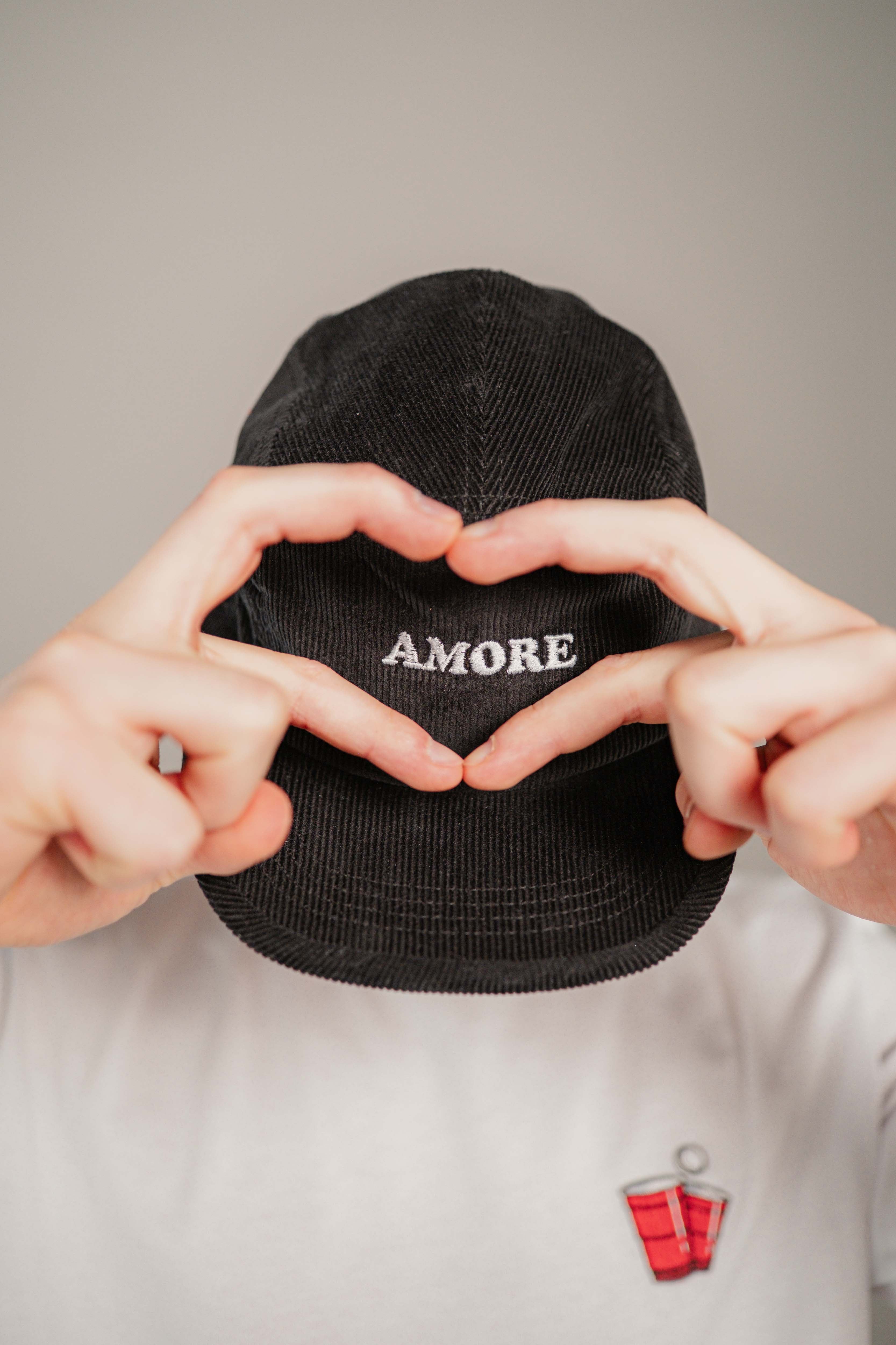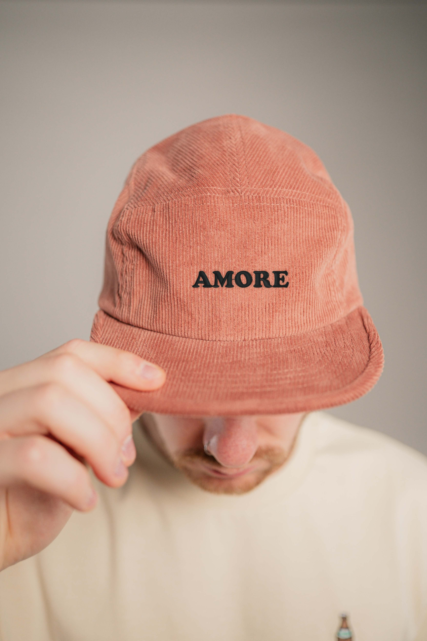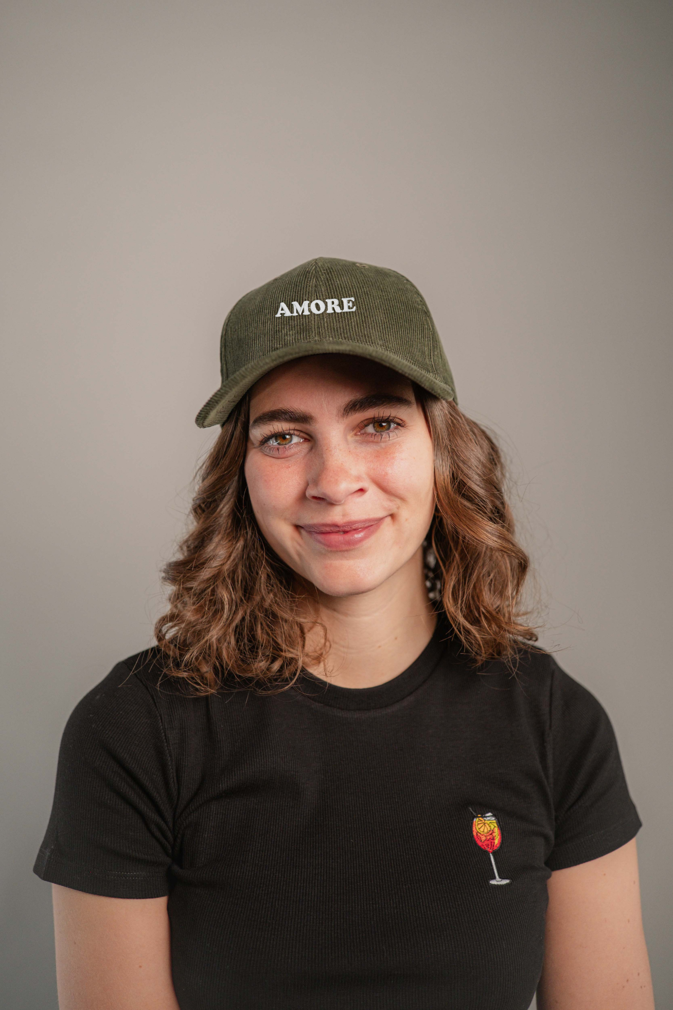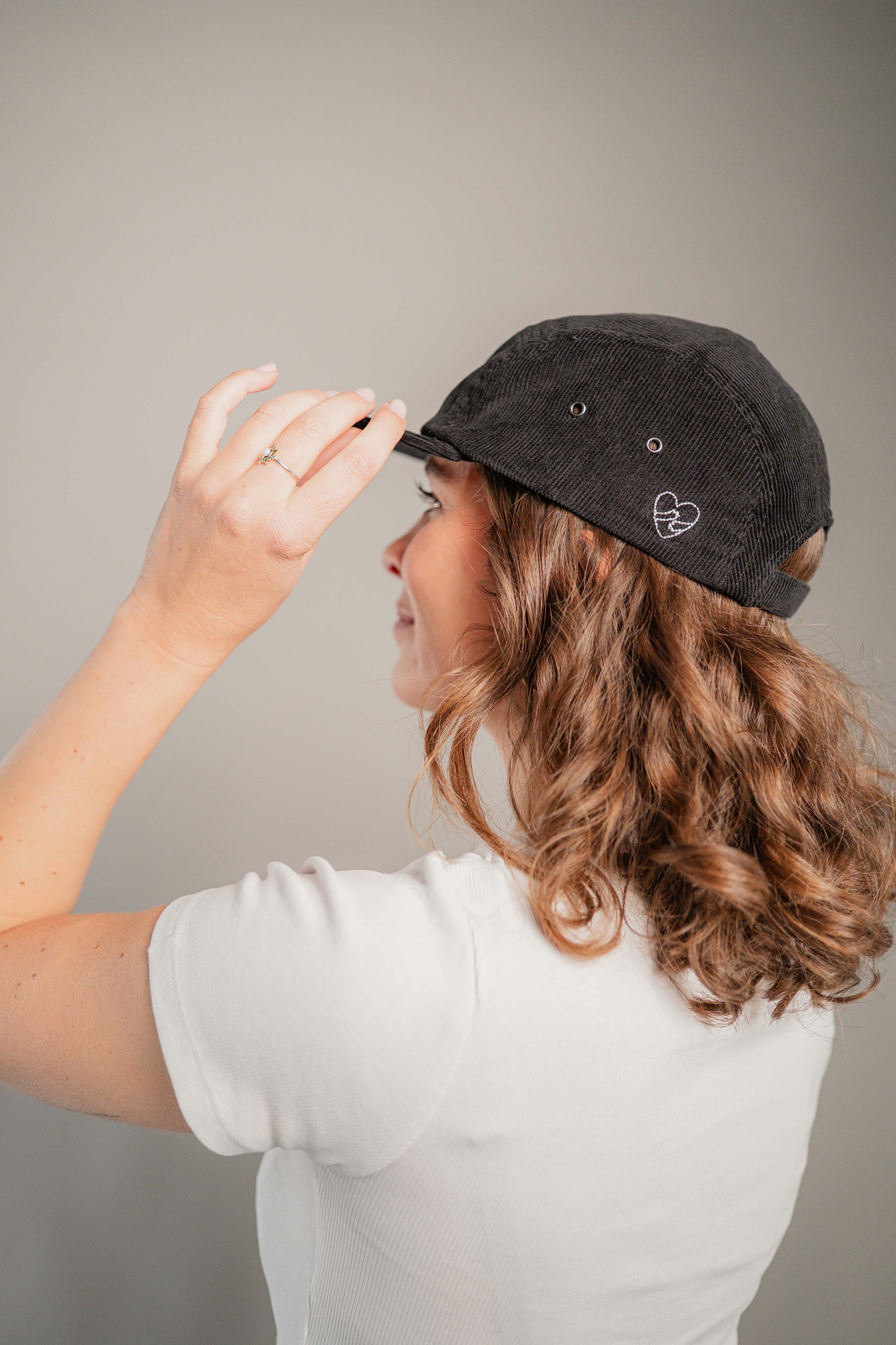 Super hochwertige Cord Cap aus 100% Bio Baumwolle mit gesticktem Amore Schriftzug vorne und kleinem gesticktem Herz seitlich