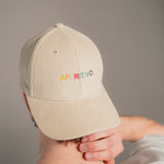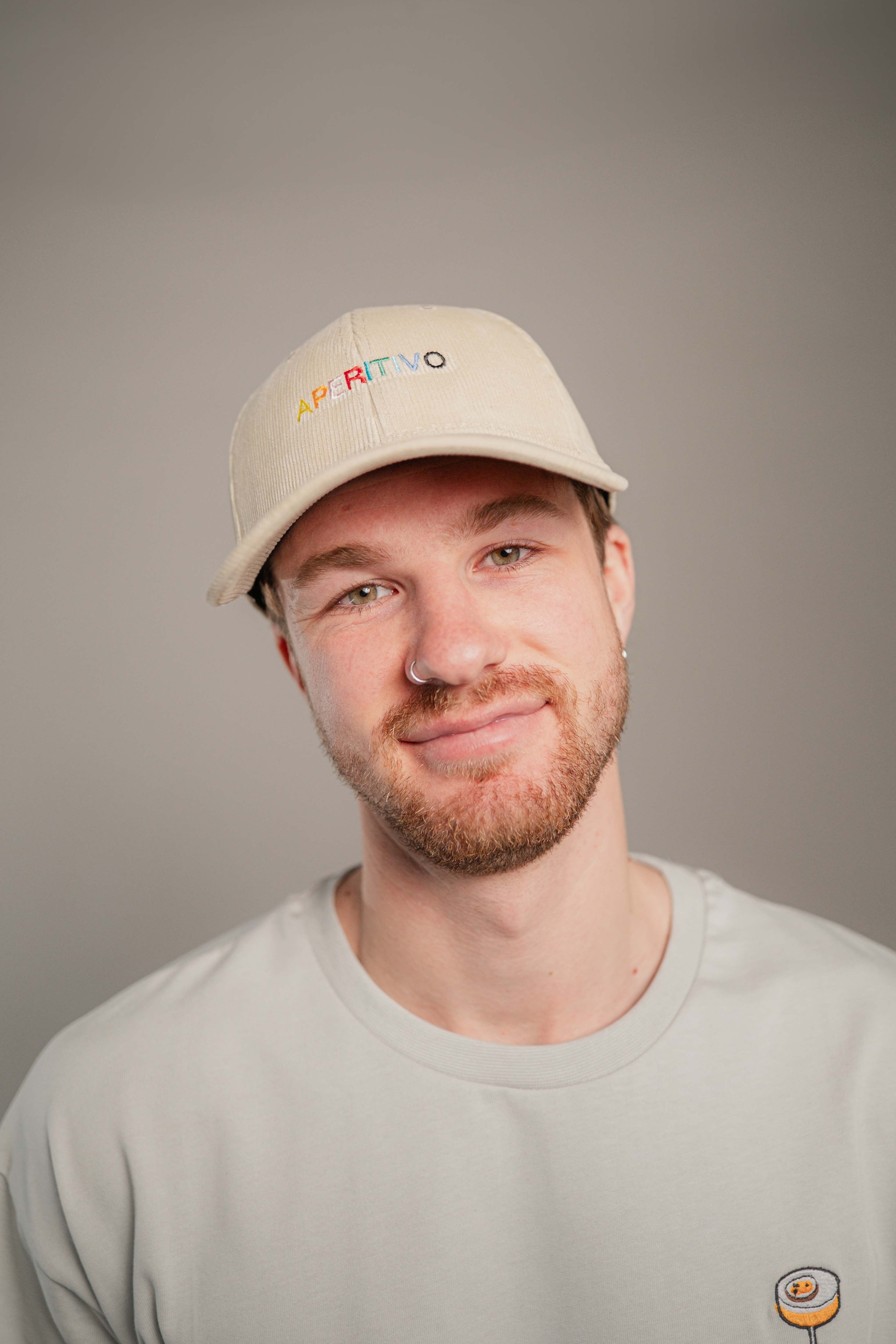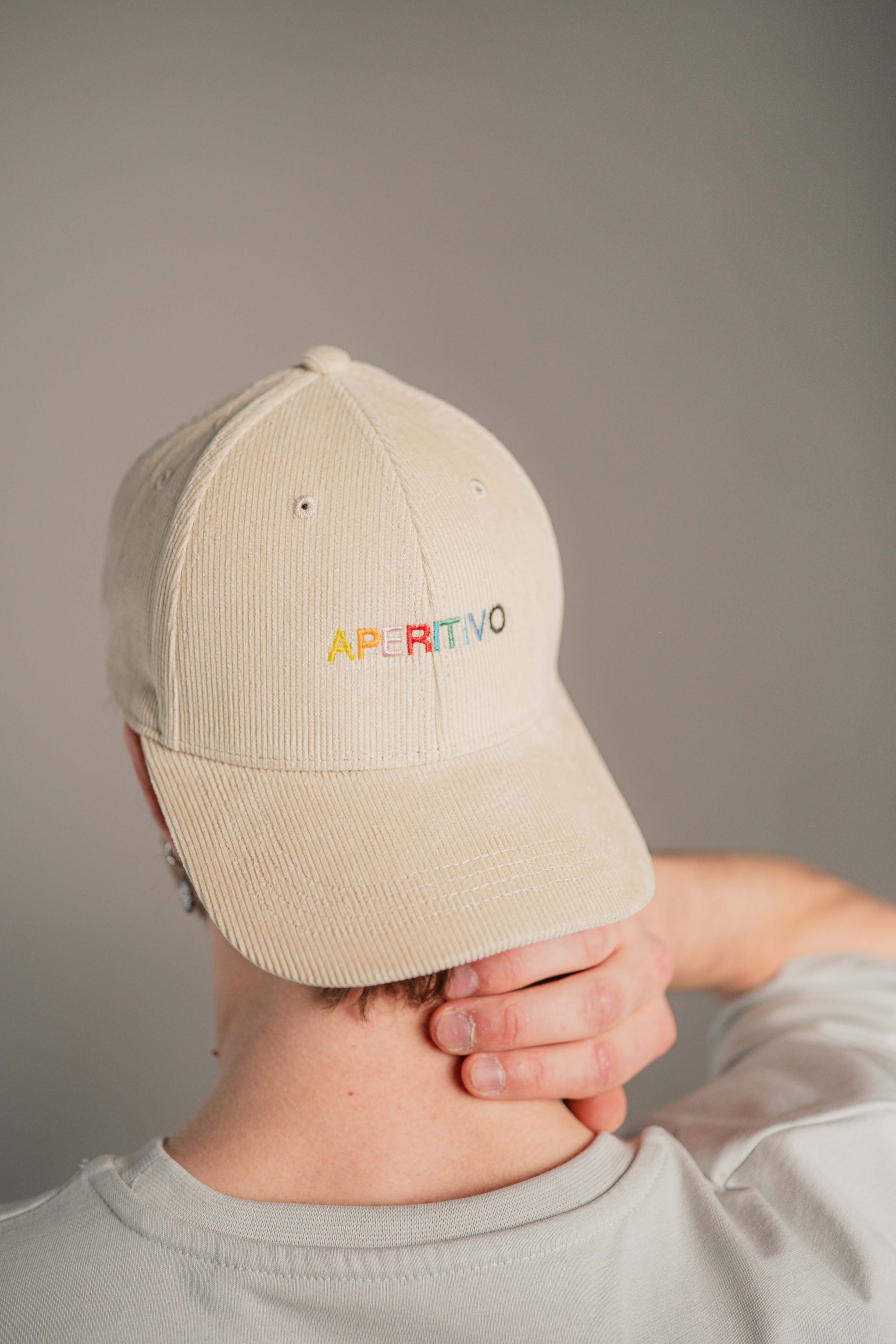 Super hochwertige Cord Cap aus 100% Bio Baumwolle mit gesticktem Aperitivo Schriftzug vorne und kleinem gesticktem Spritz Glas seitlich