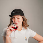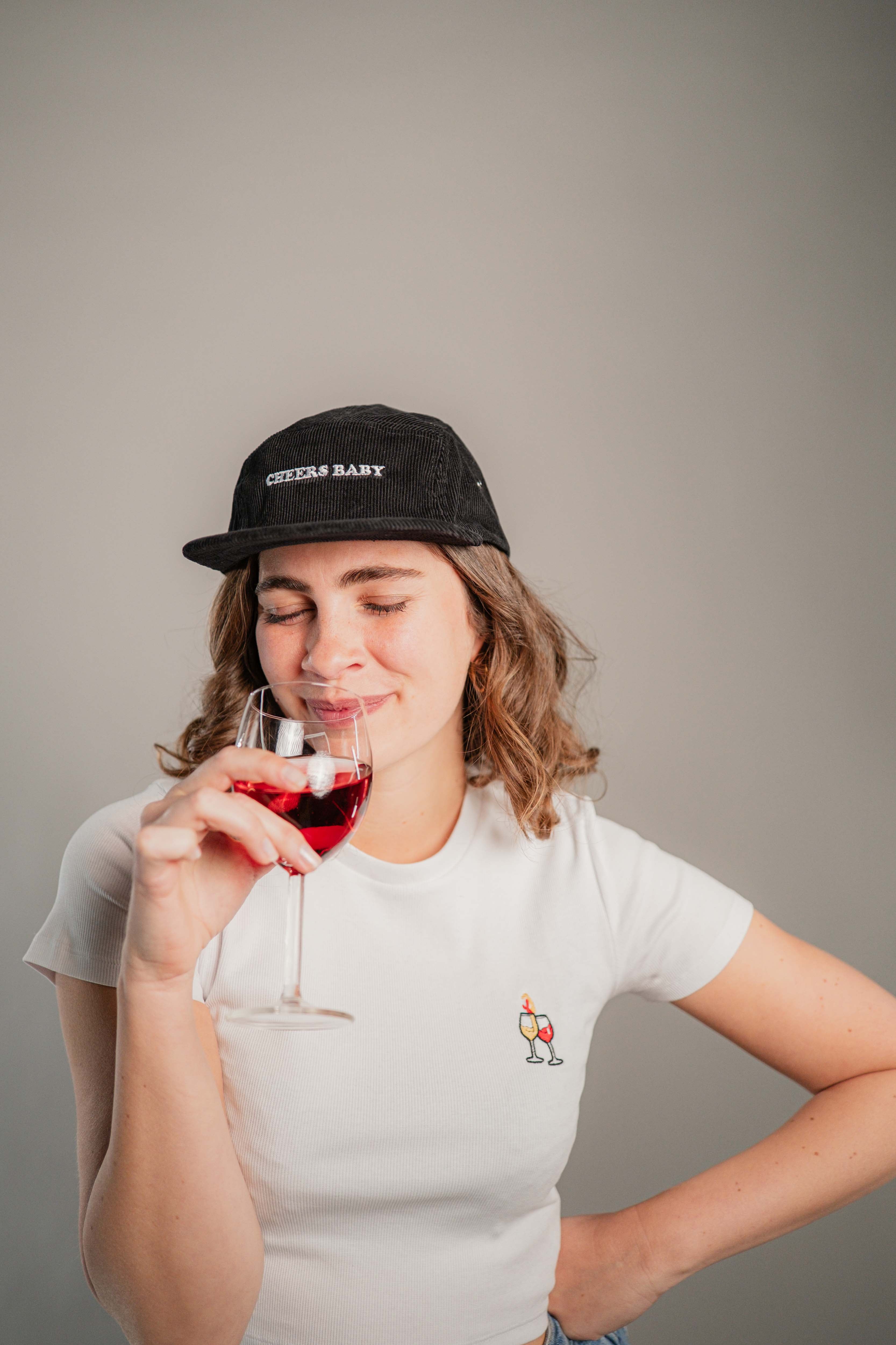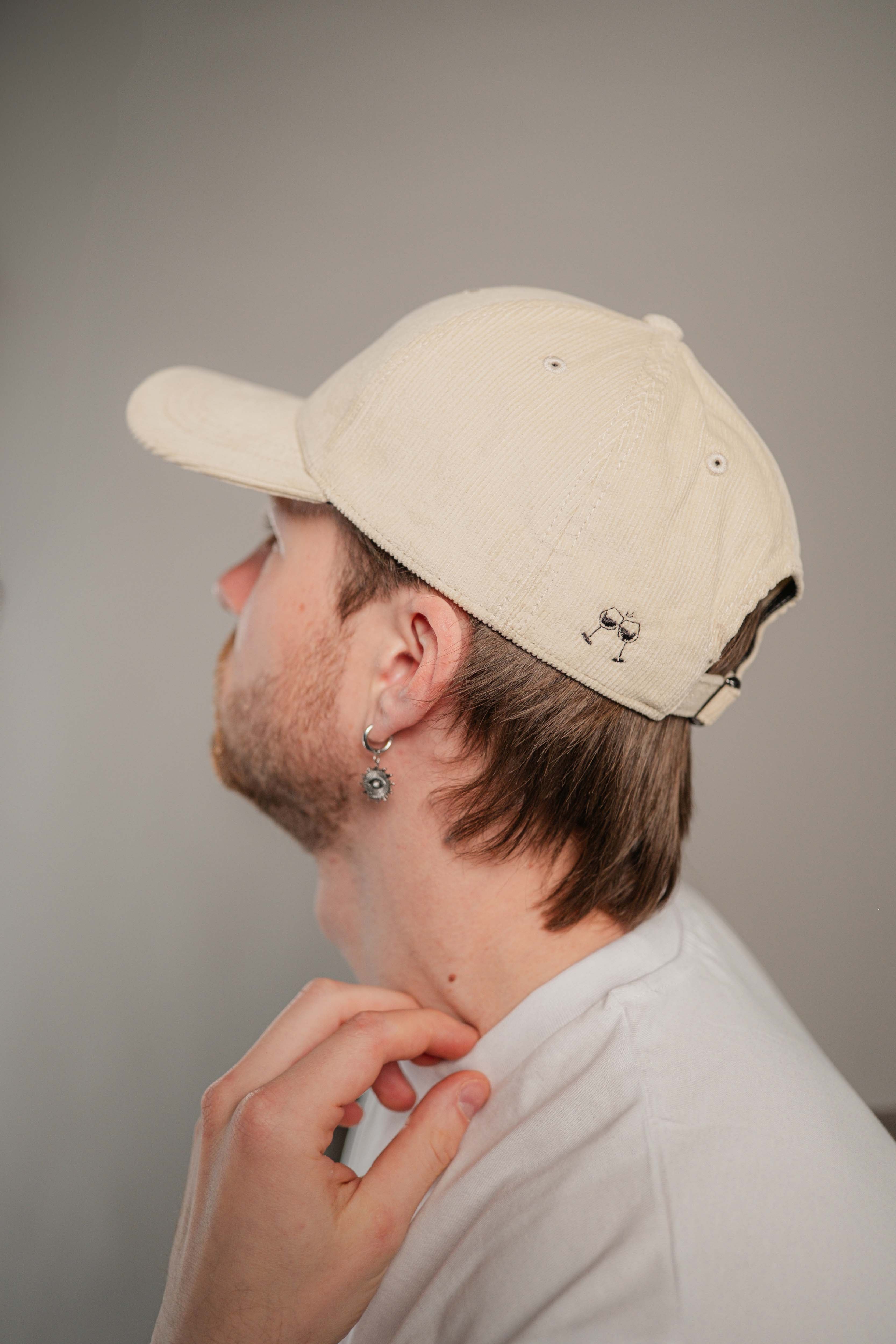 Super hochwertige Cord Cap aus 100% Bio Baumwolle mit gestickten Cheers Baby Schriftzug vorne und kleinen gestickten Weingläßern seitlich