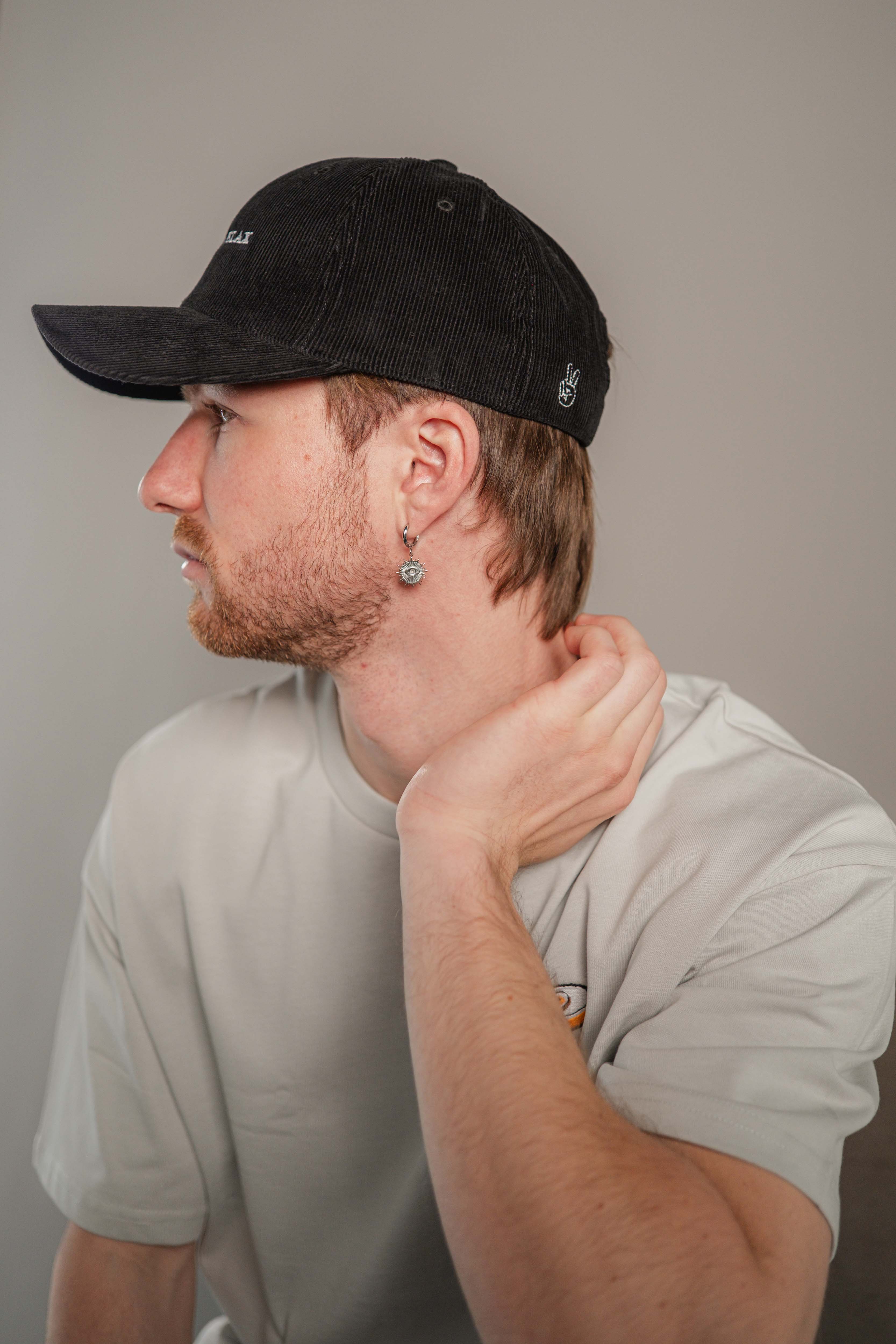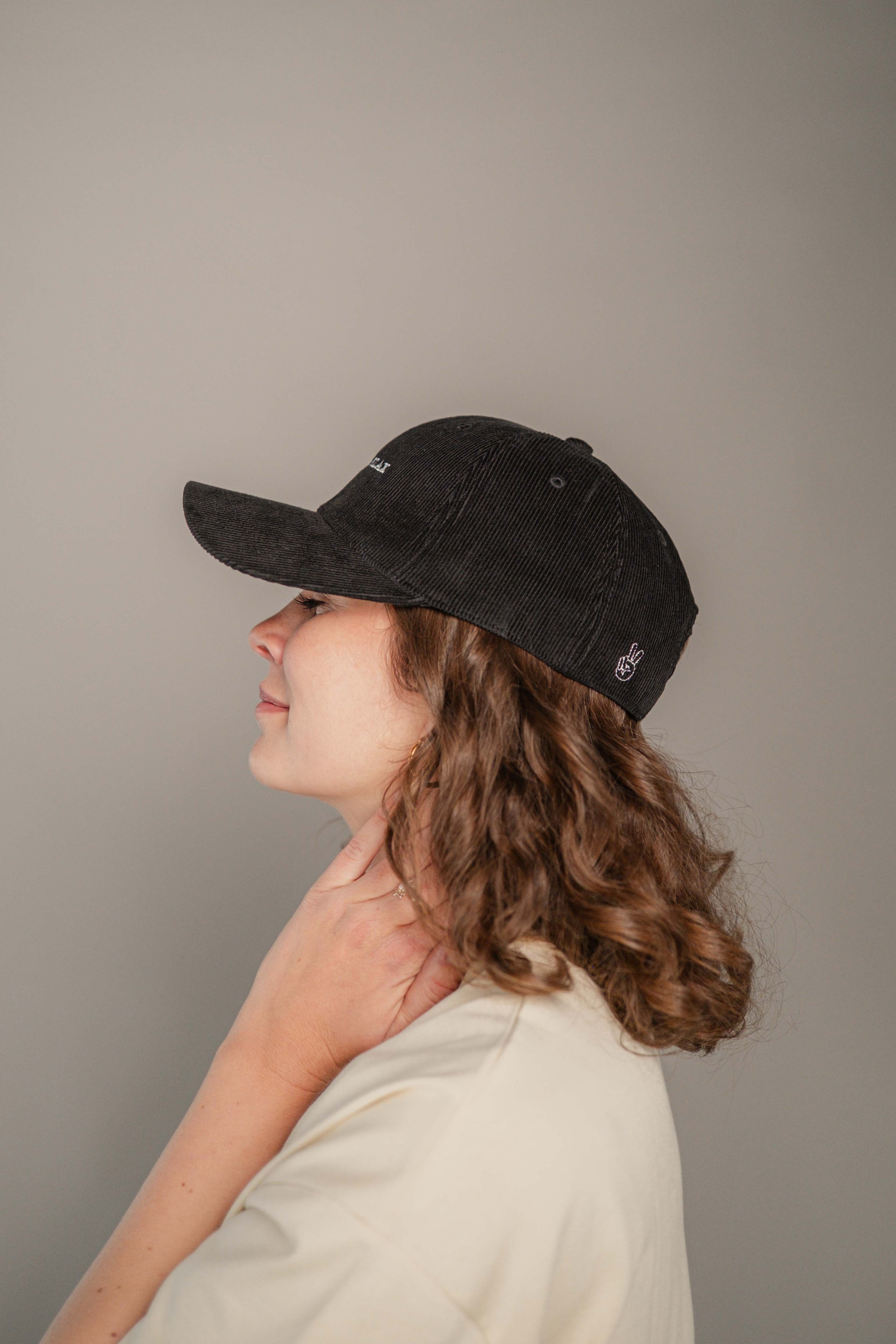 Super hochwertige Cord Cap aus 100% Bio Baumwolle mit gesticktem Slip & Relax Schriftzug vorne und kleiner gestickter Peace-Hand  seitlich