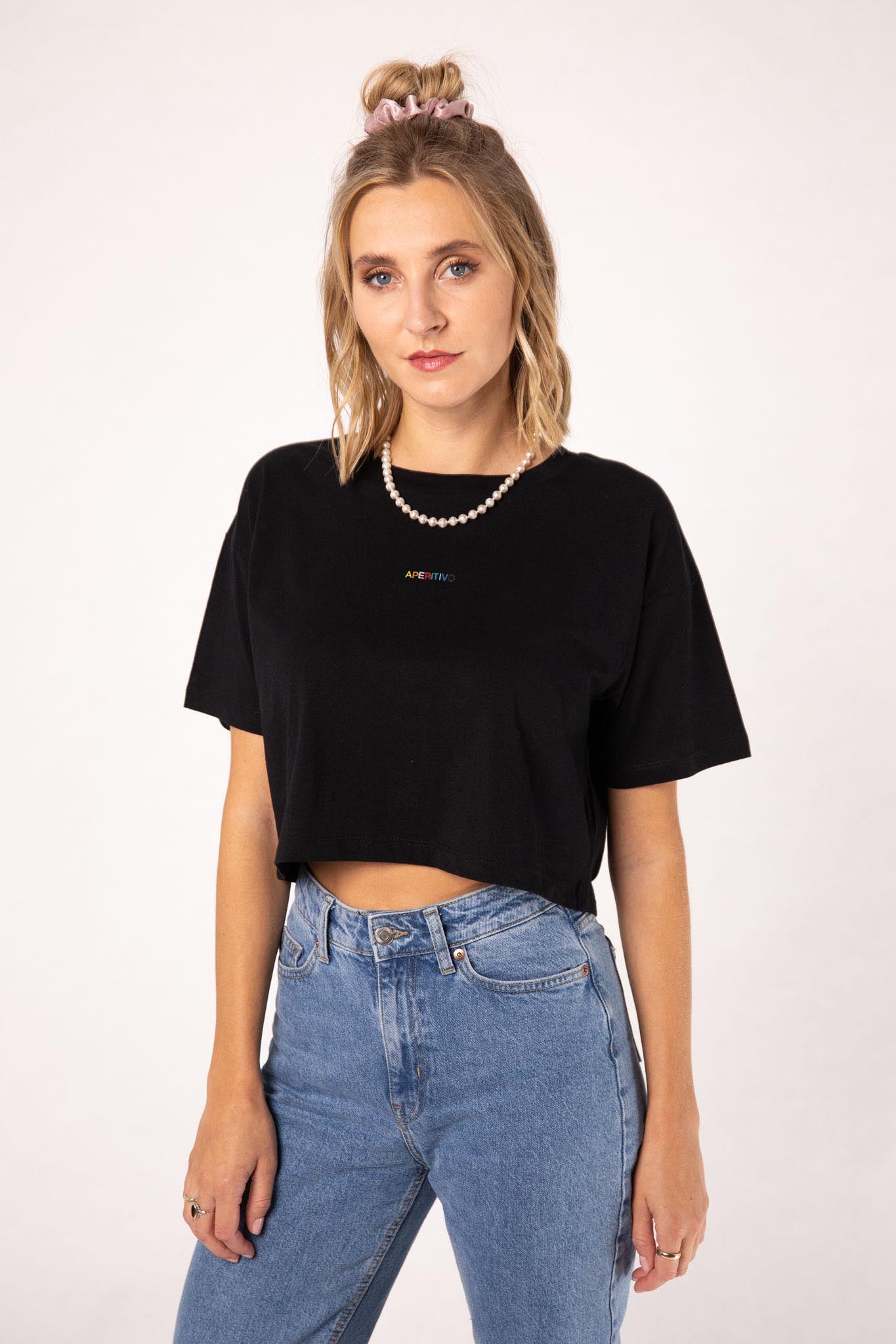 Super hochwertiges Bio Baumwoll Cropped T-Shirt mit gesticktem Aperitivo Schriftzug in drei verschiedenen Schnitt-Varianten: Ripped, Regular & Oversized
