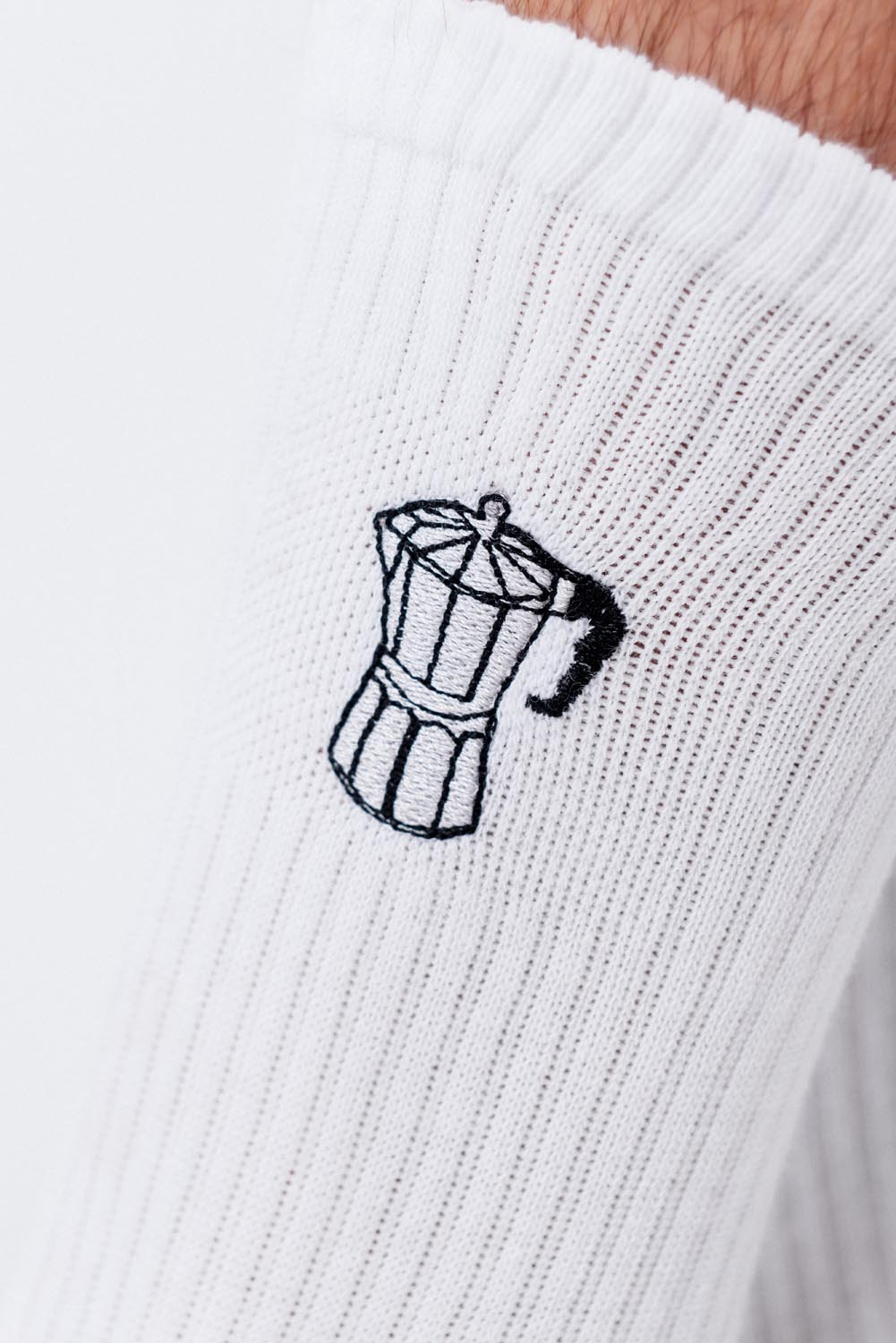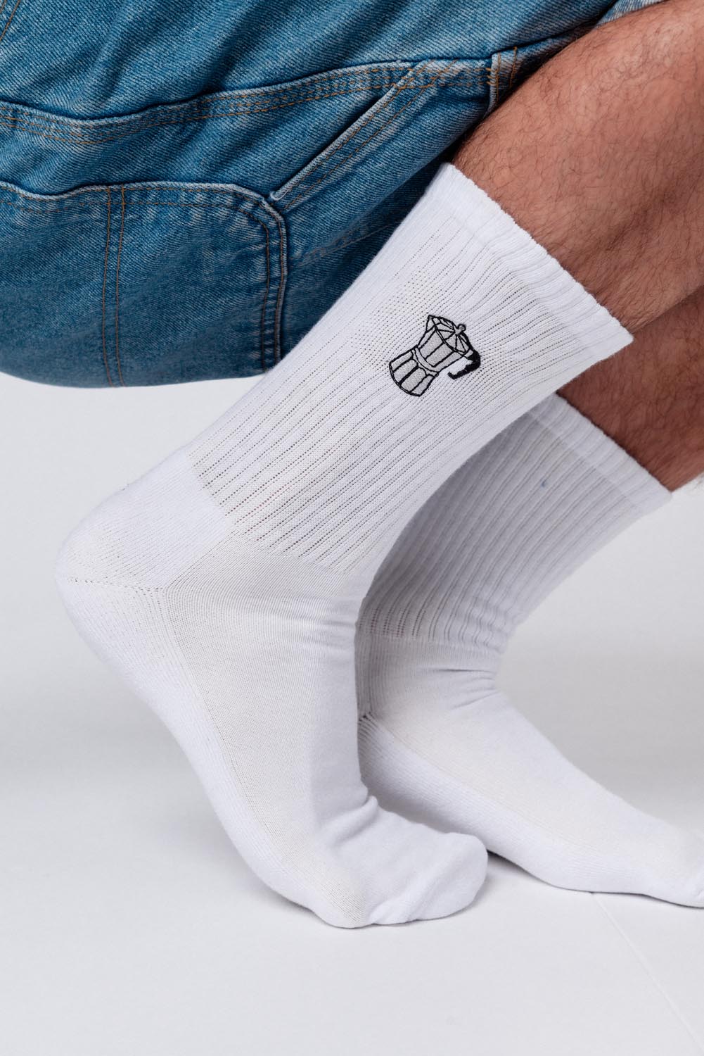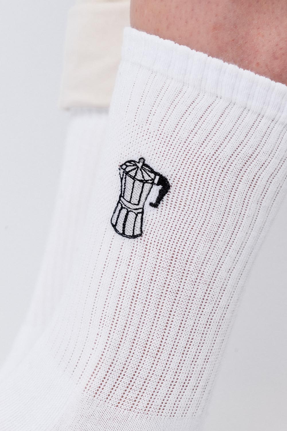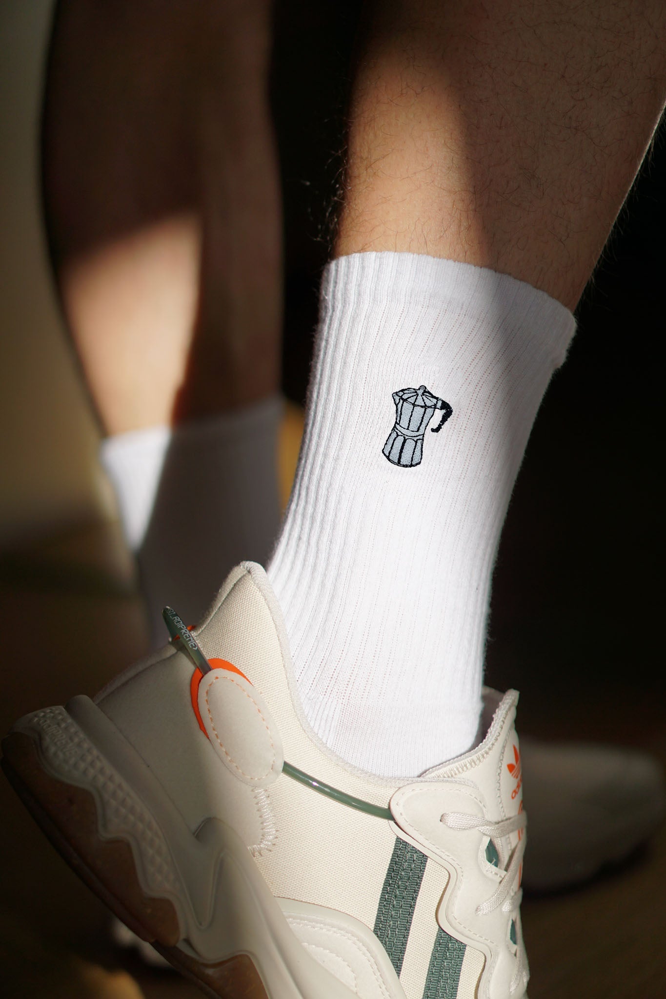 Super hochwertige Bio Baumwoll Crew Socken mit gesticktem Espressokocher Design