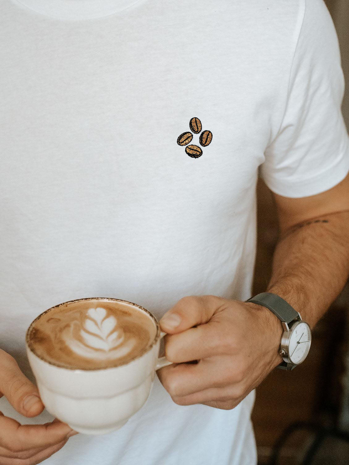 Super hochwertiges Bio Baumwoll Unisex T-Shirt mit schwerem Stoff (190gsm) und gesticktem Coffe Beans Design