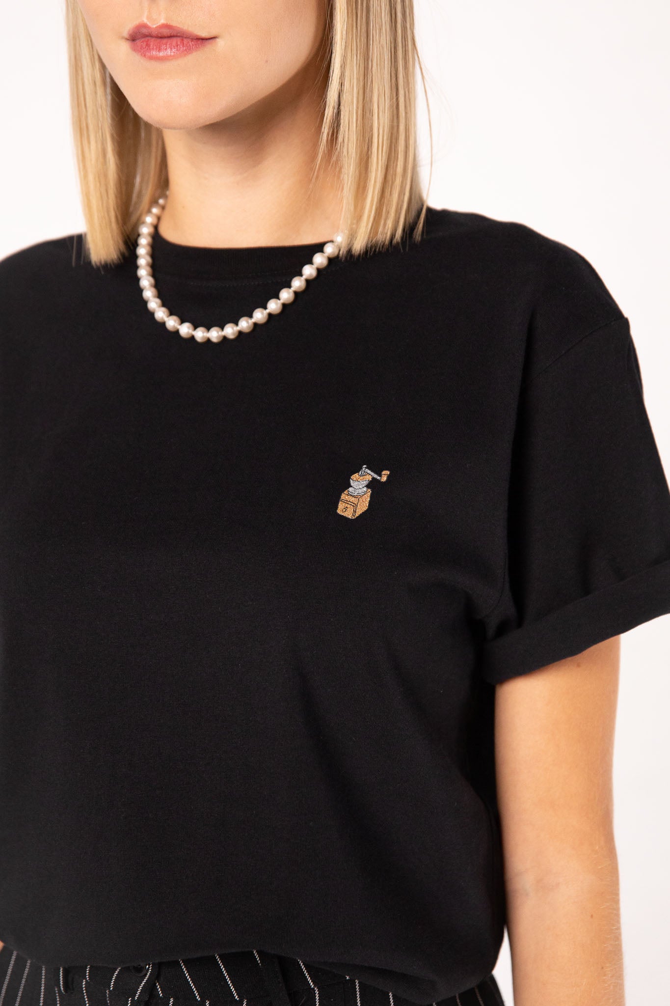 Super hochwertiges Bio Baumwoll Frauen T-Shirt mit extrem angenehmen Stoff (180gsm) und gesticktem Kaffeemühle Design
