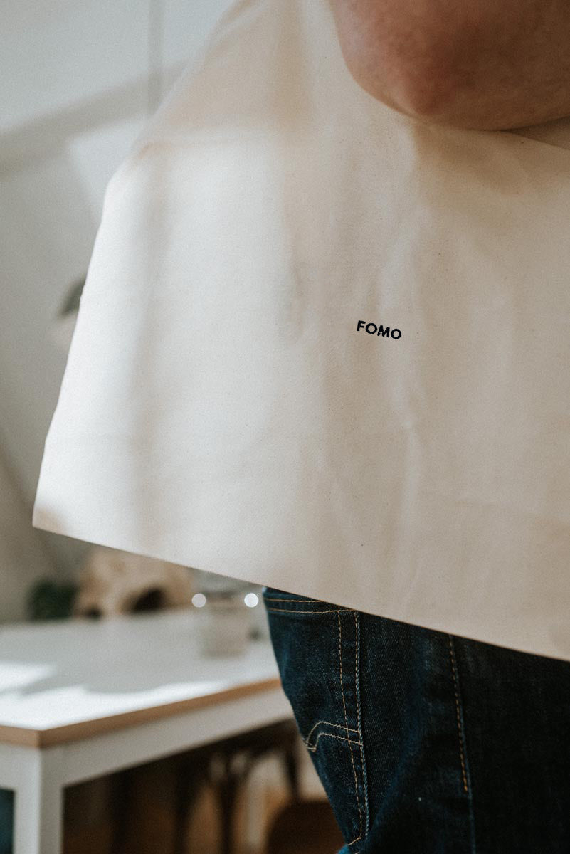Sac de transport en coton bio brodé, produit de manière équitable, avec l'inscription FOMO (Fear of missing out).