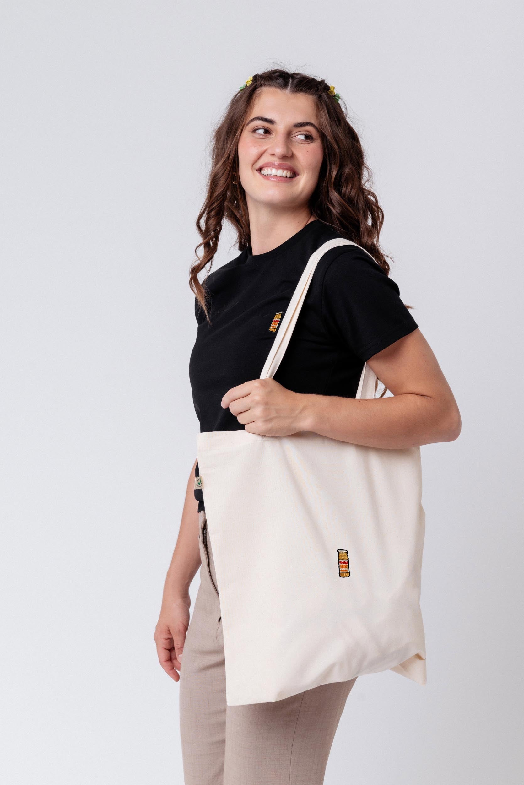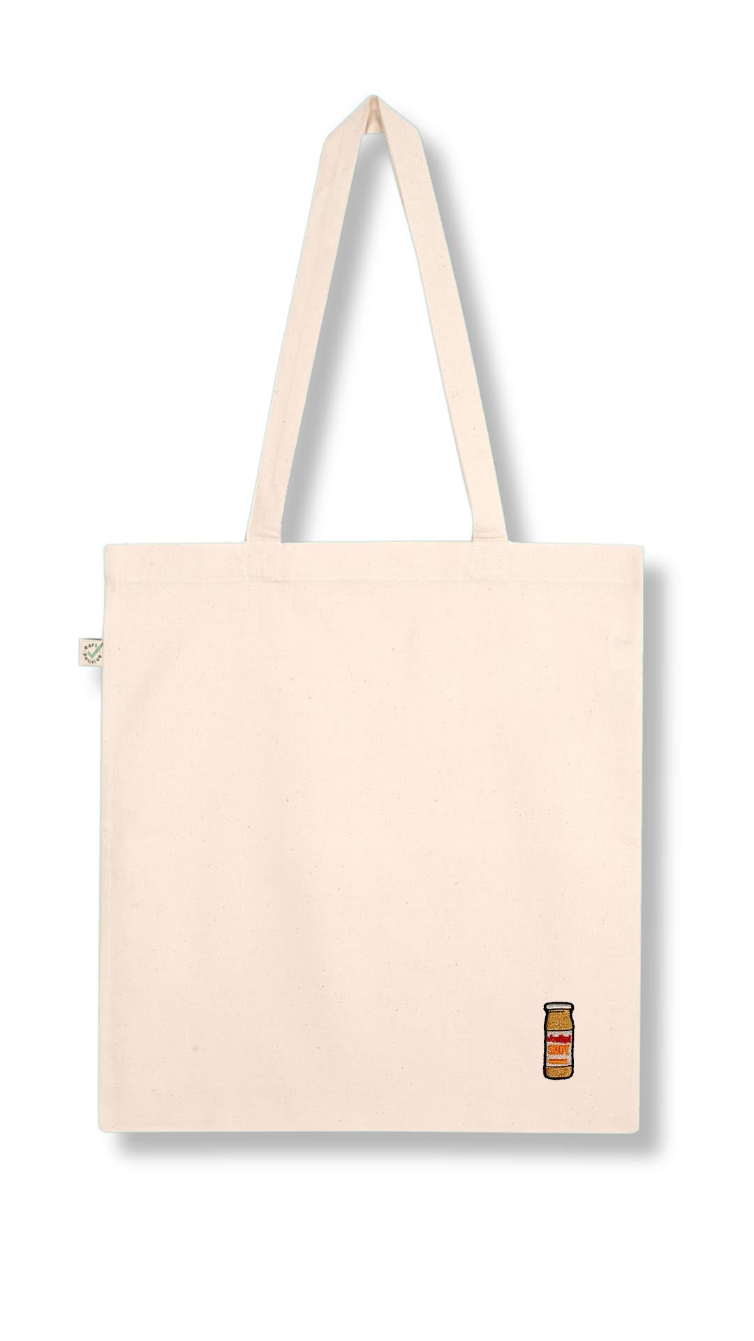 Bestickte, fair produzierte Bio-Baumwoll-Tragetasche im offiziellen Voelkel Ingwer Shot Design.
