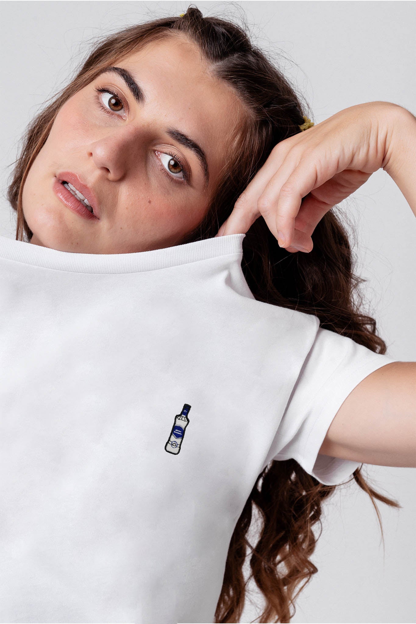 T-shirt en coton bio pour femme de super qualité avec un tissu extrêmement agréable (155gsm) et la bouteille officielle de Gorbatchev brodée.