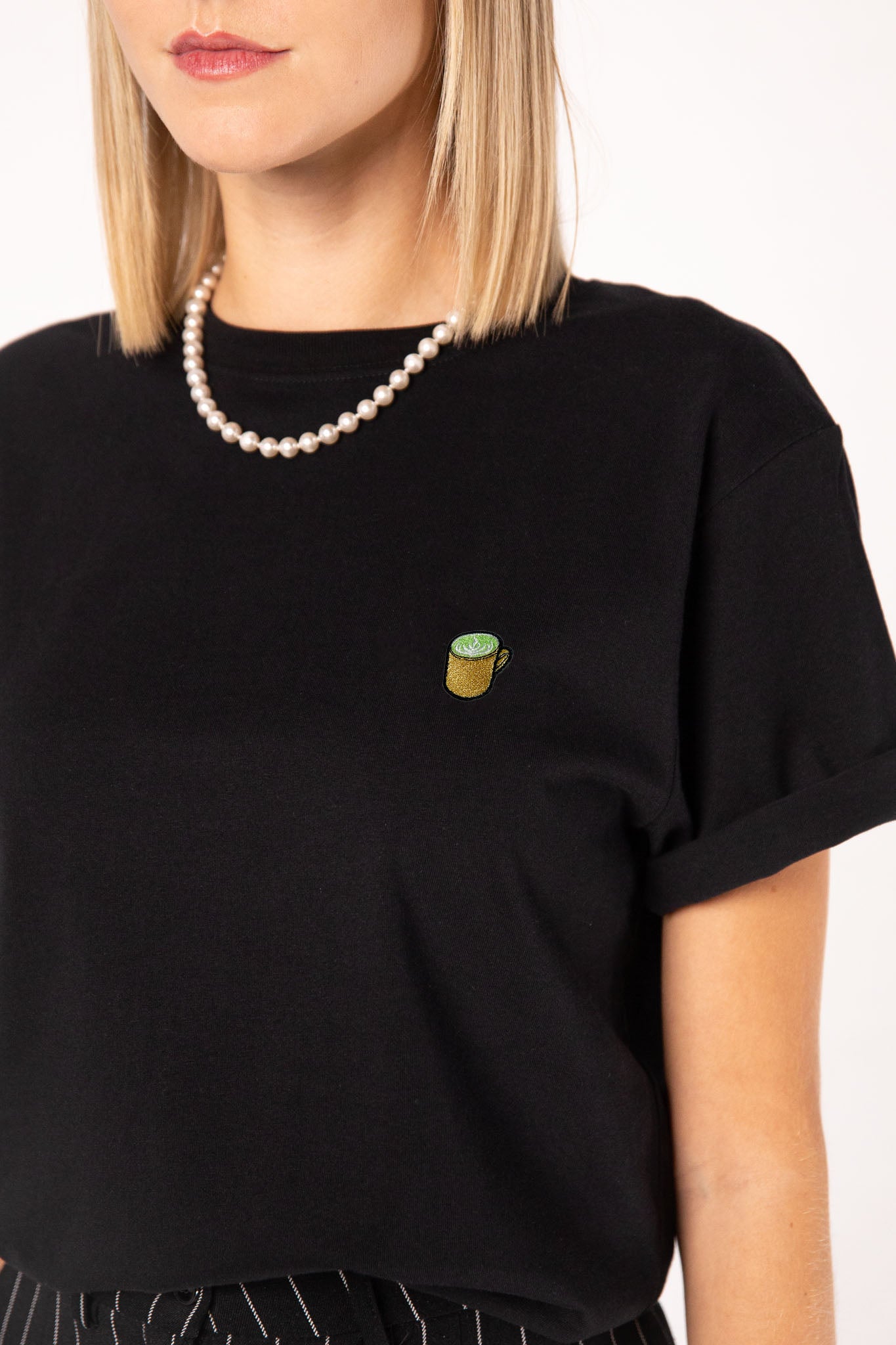 Super hochwertiges Bio Baumwoll Frauen T-Shirt mit extrem angenehmen Stoff (180gsm) und gesticktem Matcha Latte Design