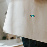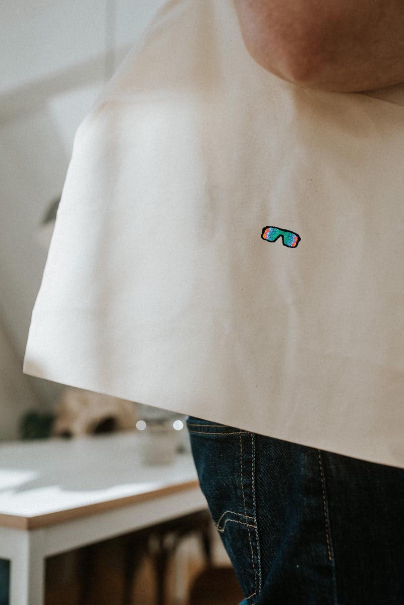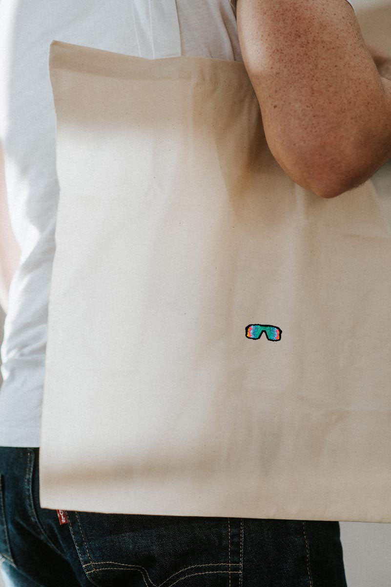 Sac de transport en coton bio brodé et fabriqué de manière équitable, au design de lunettes rapides.