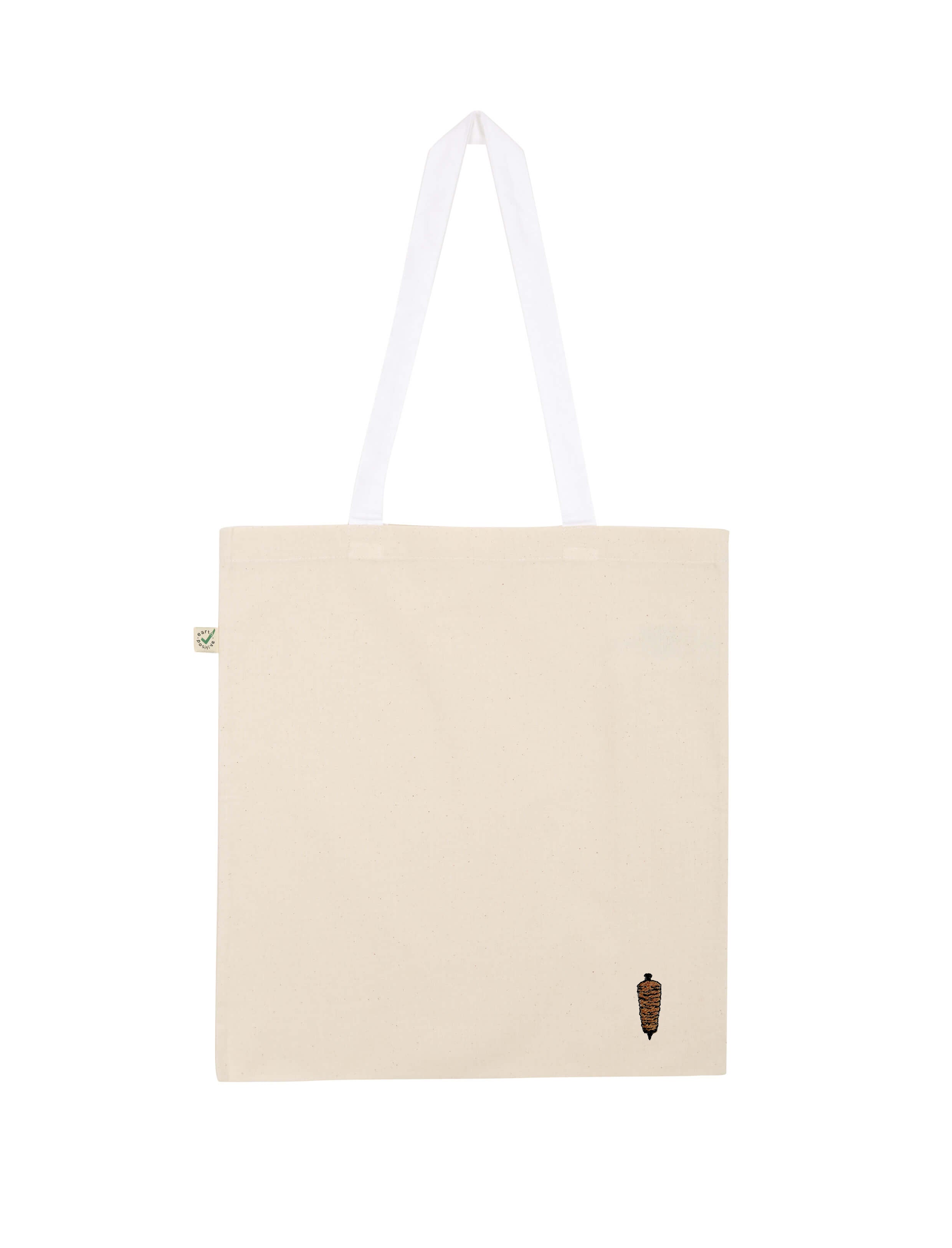Bestickte, fair produzierte Bio-Baumwoll-Tragetasche im Dönerspieß Design.