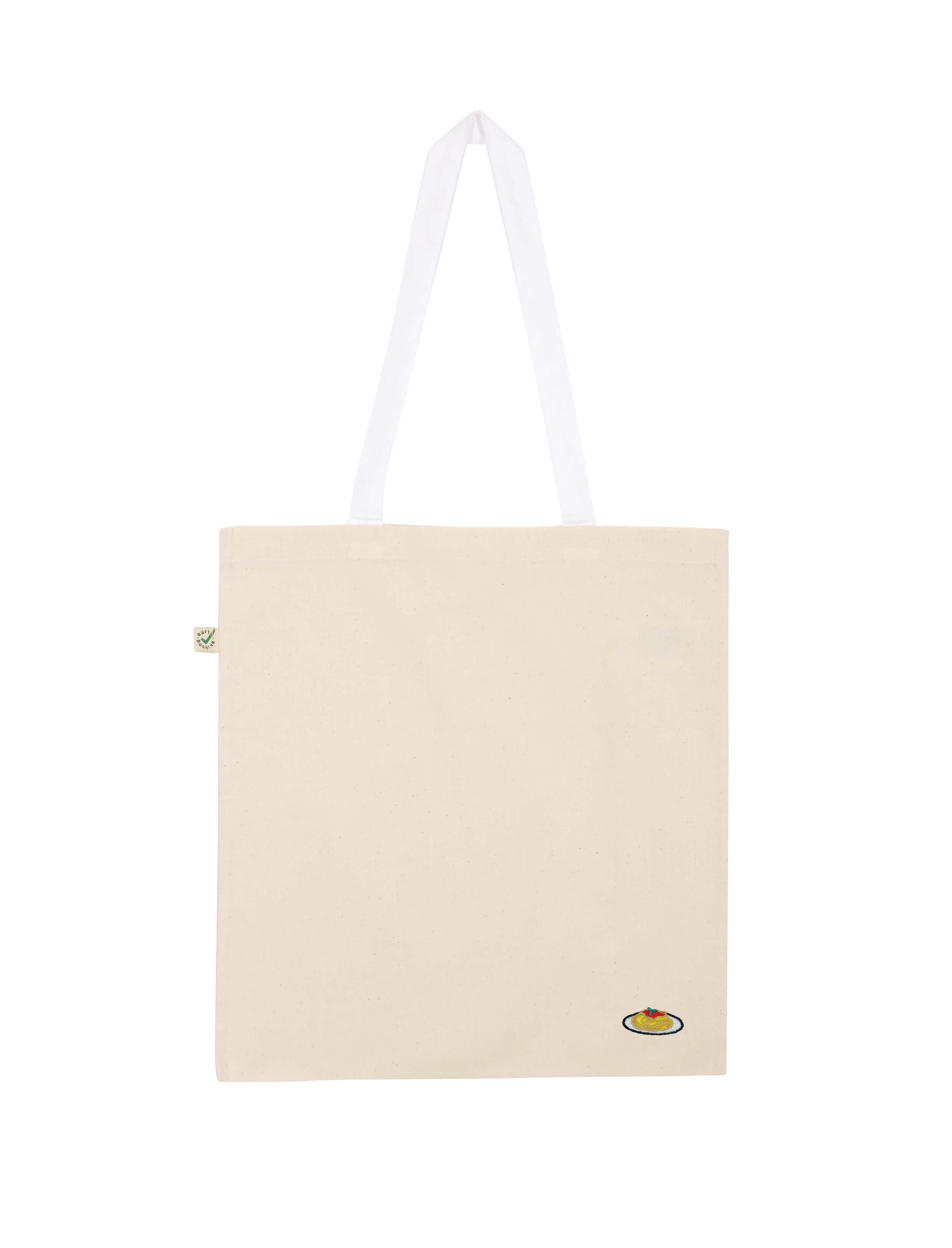 Bestickte, fair produzierte Bio-Baumwoll-Tragetasche im Pasta Design.