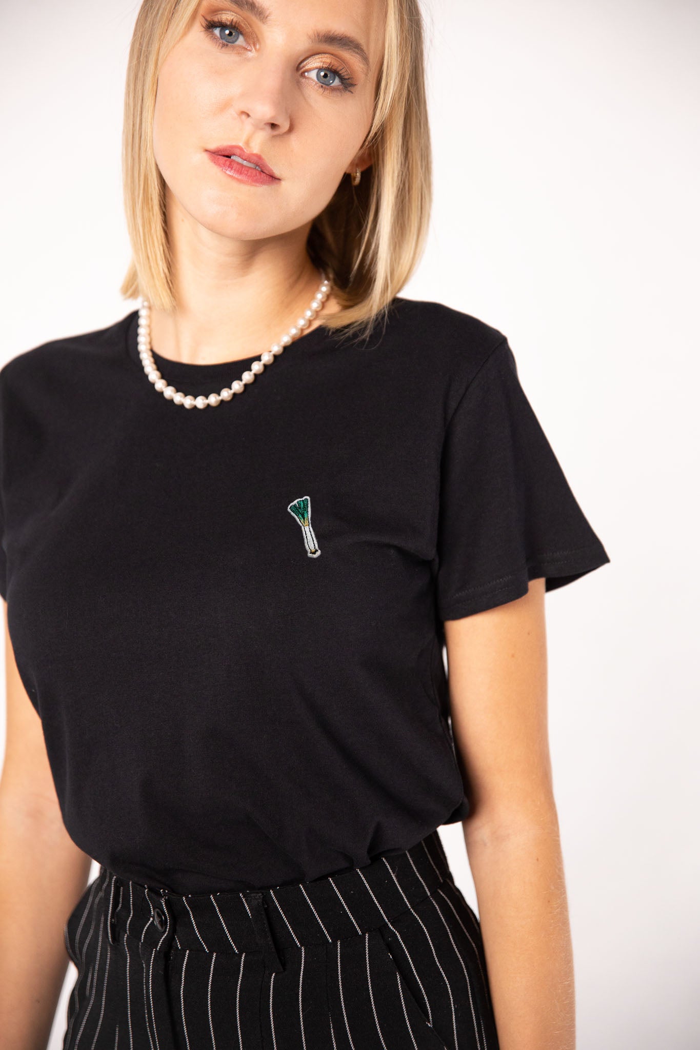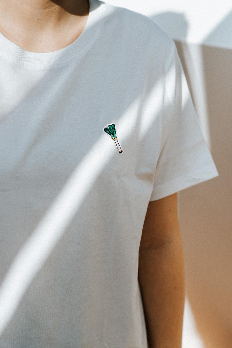 Besticktes Bio Baumwoll Frauen T-Shirt mit extrem angenehmen Stoff (155gsm) und gesticktem Lauch Design