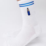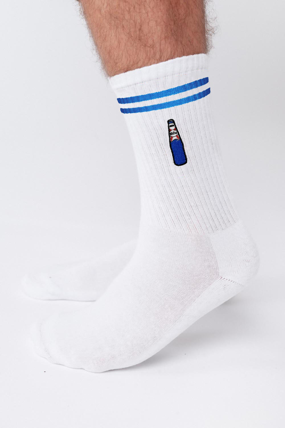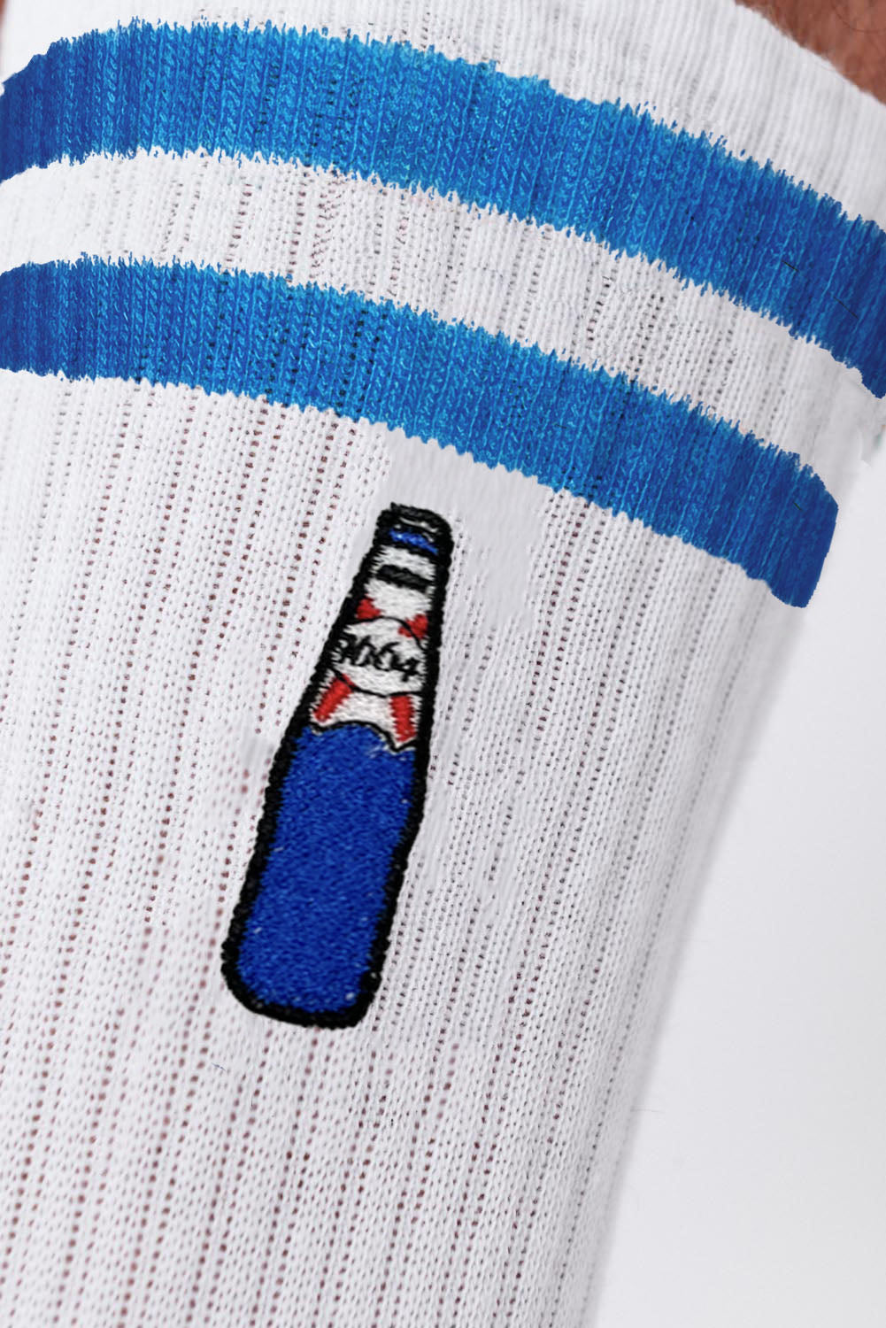Zwei edle blau-weiße Streifen machen das Design komplett und bringen dir das französische Savoir-vivre direkt an die Füße. 🇫🇷🧦🍺