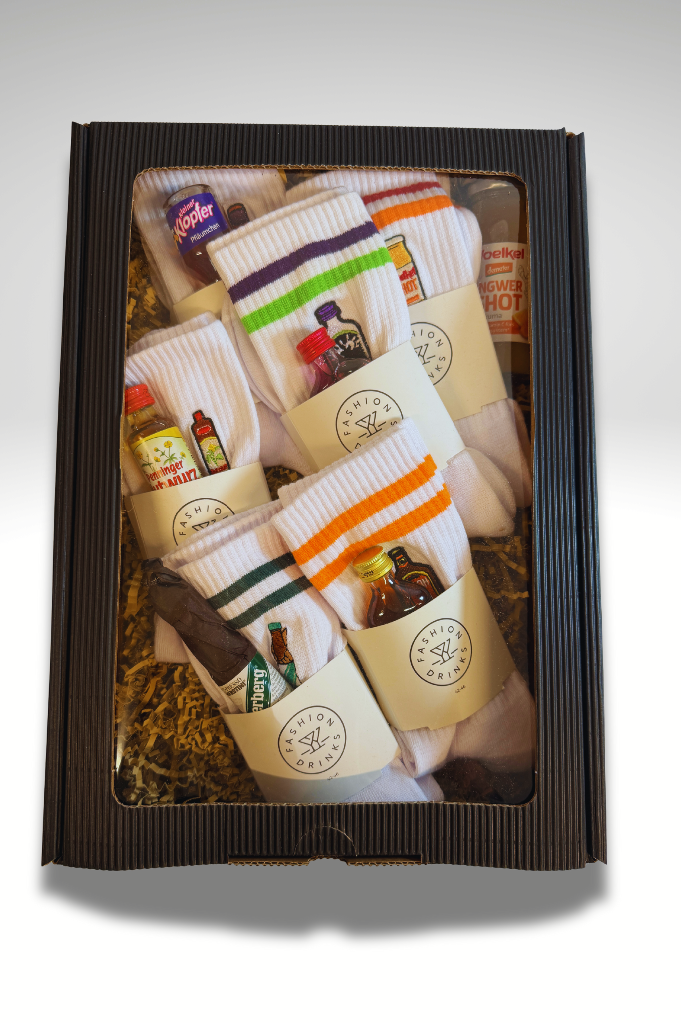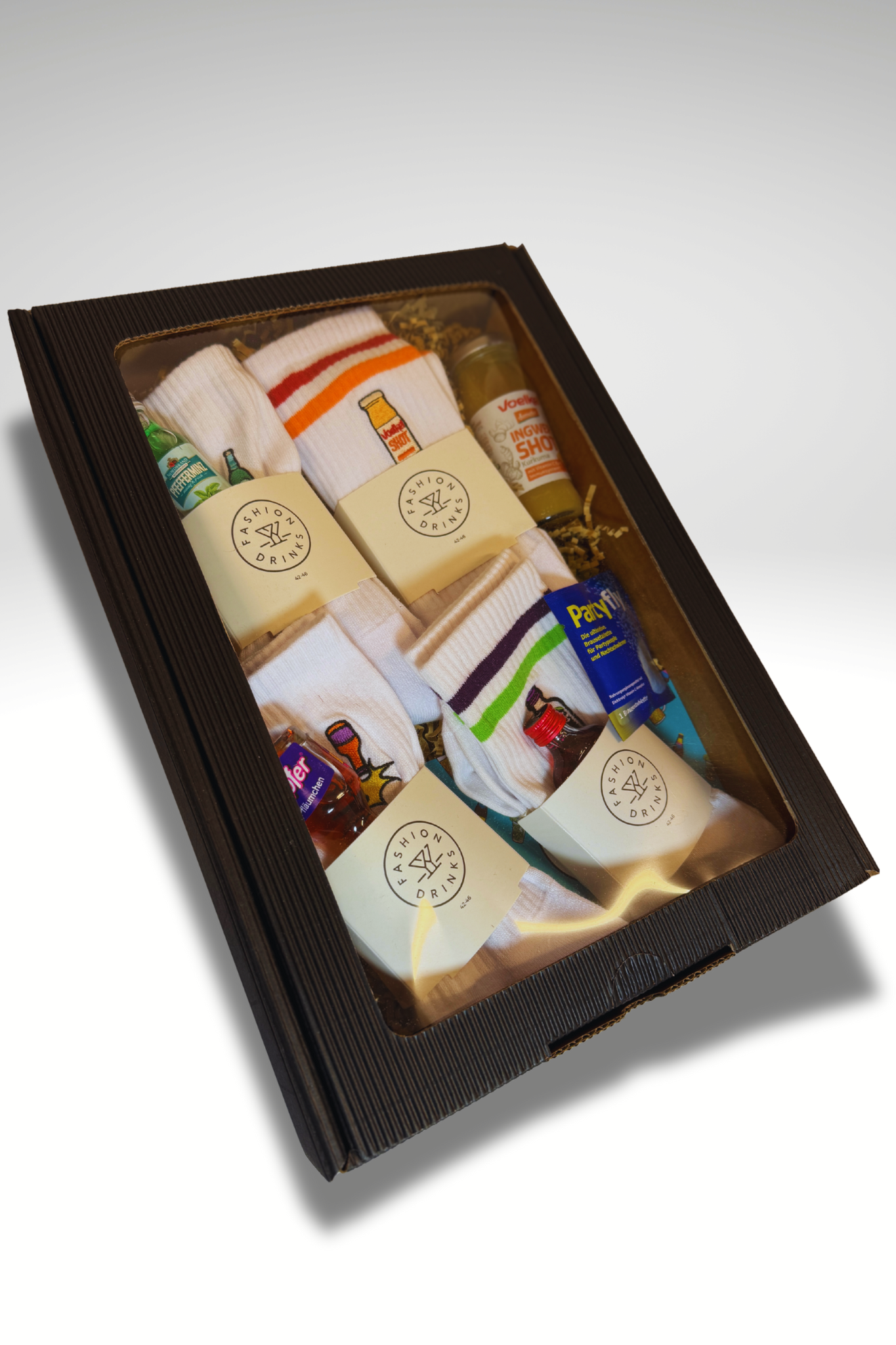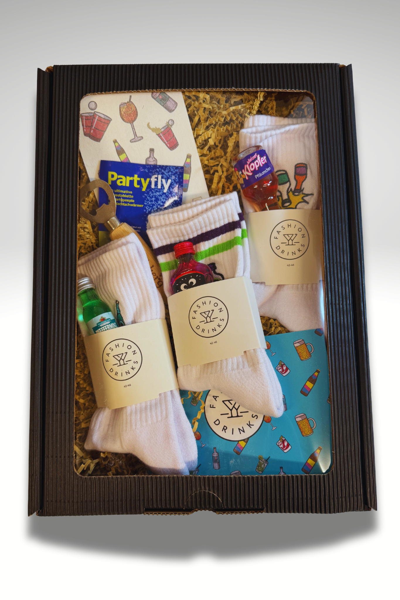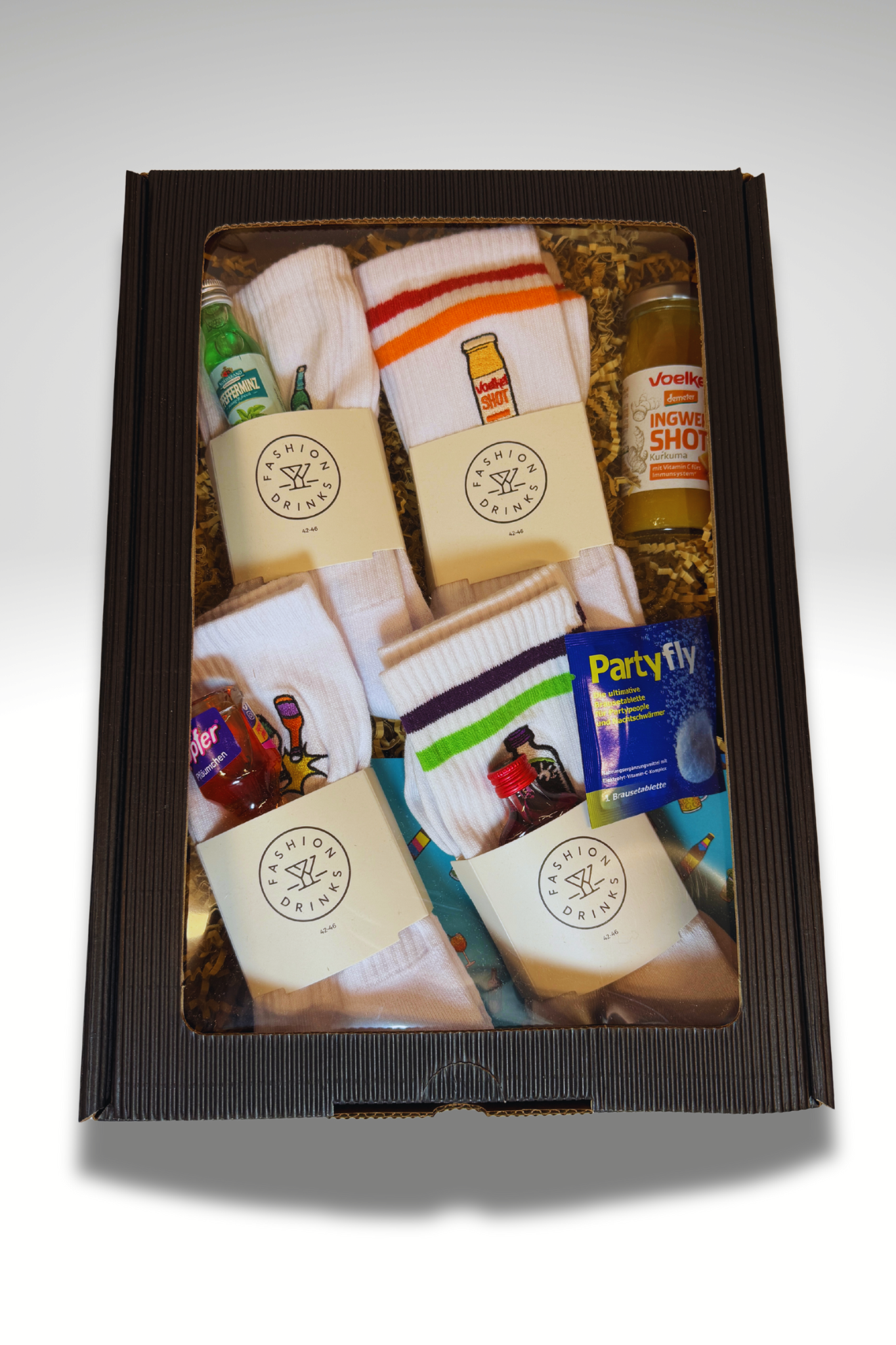 🍸 4x besticke Fashion Drinks Socken (Feigling, Kleiner Klopfer, Pfeffi, Voelkel), 3x Shots (Feigling, Kleiner Klopfer, Pfeffi, Voelkel Ingwer Shot), 1x Partyfly, 1x FD Postkarte