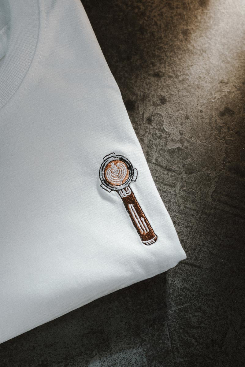 Bestickte, Fair produzierte Bio-Baumwoll-Tragetasche im Siebträger Latte Arte Design.