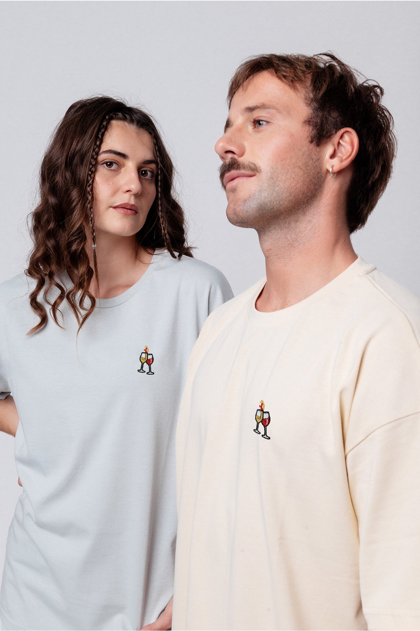 Heavy Oversized Bio Baumwoll T-Shirt mit extra schwerem Stoff (230gsm) und dem gestickten Wein Duett Design